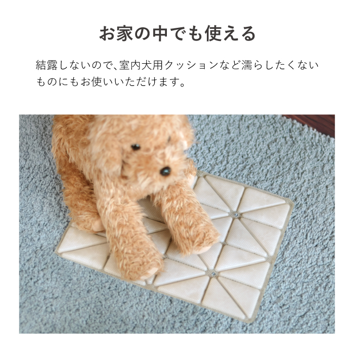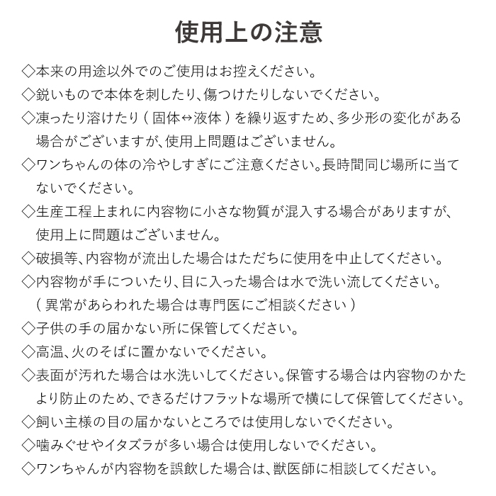 | 使用上の注意 | ◇本来の用途以外でのご使用はお控えください。 ◇鋭いもので本体を刺したり、傷つけたりしないでください。 ◇クールマットは冷却後硬くなりますので、落とさないように注意してお取り扱いください。 ◇凍ったり溶けたり(固体↔液体)を繰り返すため、多少形の変化がある場合がございますが、使用上問題はございません。 ◇ワンちゃんの体の冷やしすぎにご注意ください。長時間同じ場所に当てないでください。 ◇生産工程上まれに内容物に小さな物質が混入する場合がありますが、使用上に問題はございません。 ◇破損等、内容物が流出した場合はただちに使用を中止してください。 ◇内容物が手についたり、目に入った場合は水で洗い流してください。(異常があらわれた場合は専門医にご相談ください) ◇子供の手の届かない所に保管してください。 ◇高温、火のそばに置かないでください。 ◇表面が汚れた場合は水洗いしてください。保管する場合は内容物のかたより防止のため、できるだけフラットな場所で横にして保管してください。 ◇飼い主様の目の届かないところでは使用しないでください。 ◇噛みぐせやイタズラが多い場合は使用しないでください。 ◇ワンちゃんが内容物を誤飲した場合は、獣医師に相談してください。 |