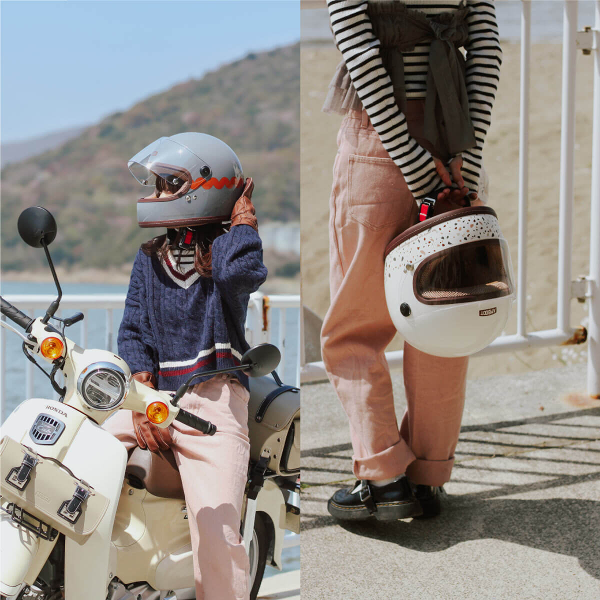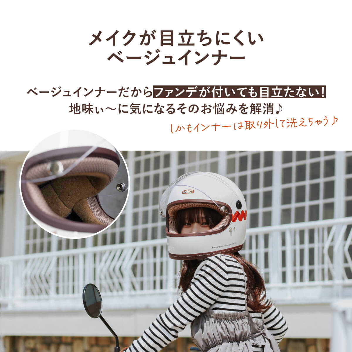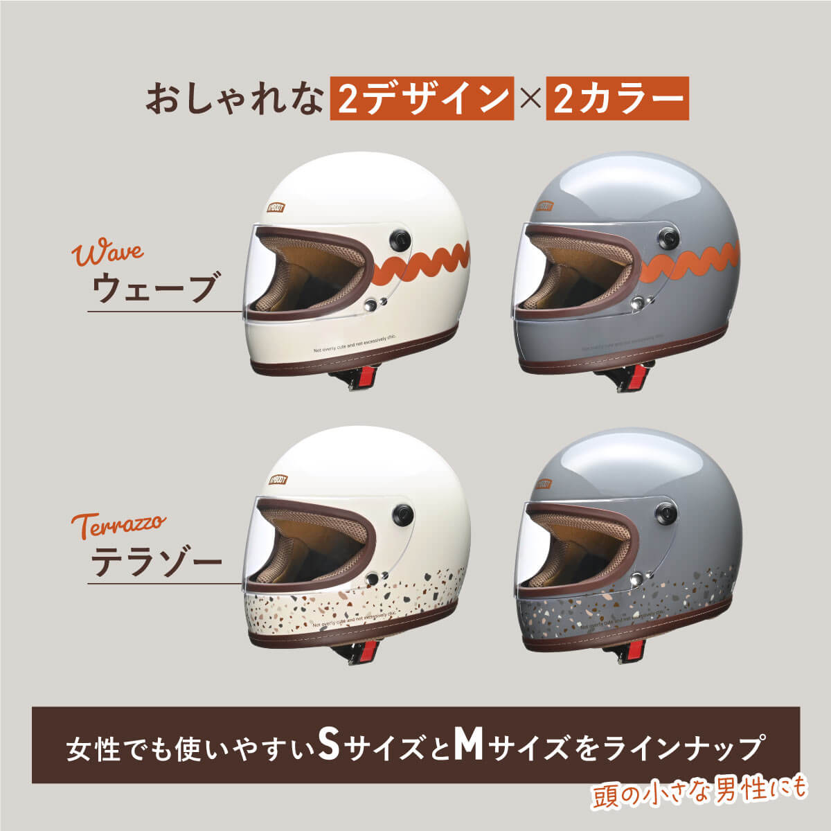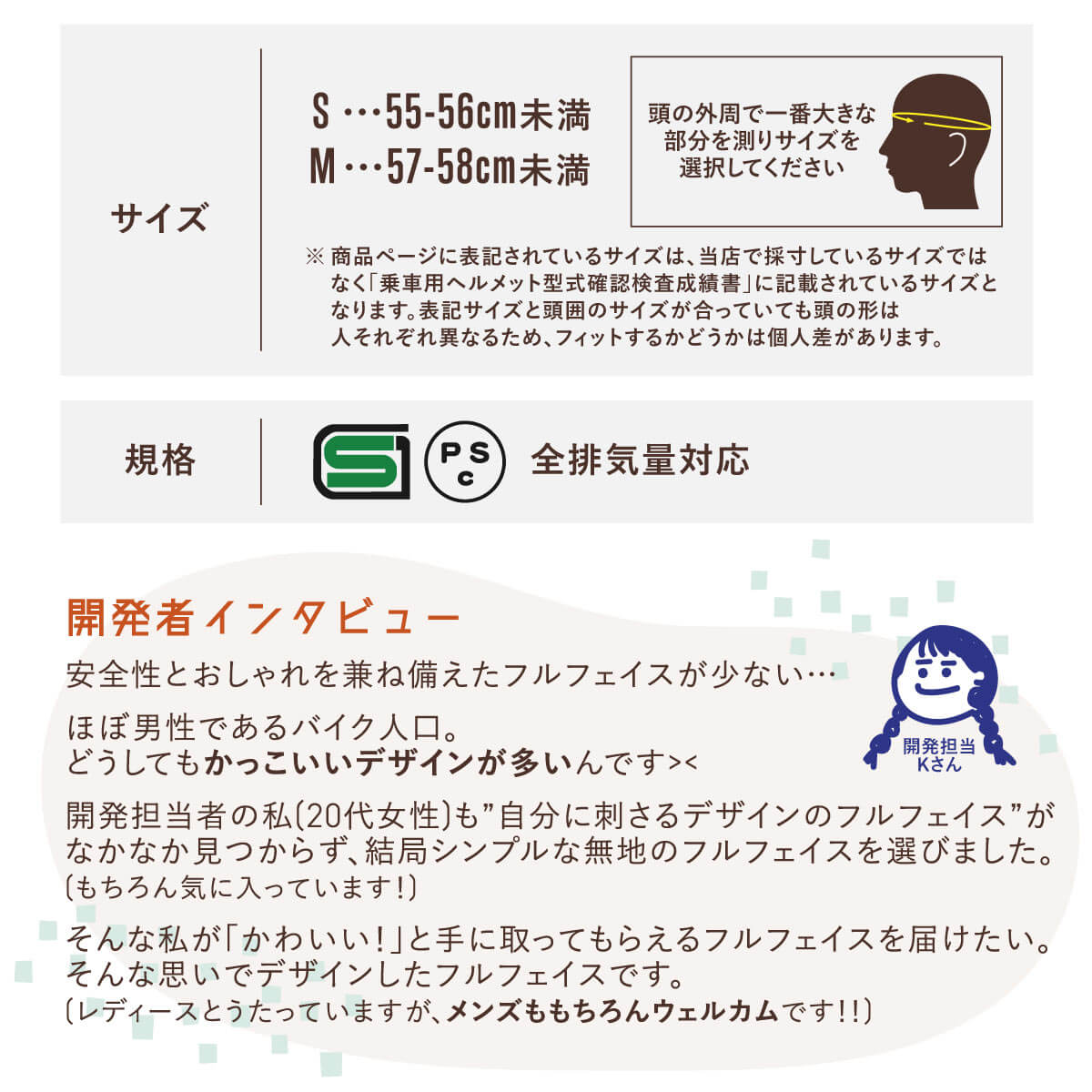 | 商品の特徴 | ◇女性目線で企画したヘルメット ◇他にはないオシャレなデザイン&カラー ◇原付から大型バイクまで全排気量に対応 ◇初心者でも安心安全のフルフェイスヘルメット ◇インナーがベージュだからファンデなどのメイクが付いても目立ちにくい ◇インナーは取り外して洗浄可能 ◇インナーの表面はメッシュ素材だから夏場でもヘルメット内の蒸れを軽減 ◇シールドには日焼けを軽減するUVカット仕様 ◇耐衝撃性の高いポリカーボネートを採用 ◇ネイルしていても着脱しやすいワンタッチバックル ◇SG規格/PSC付 |