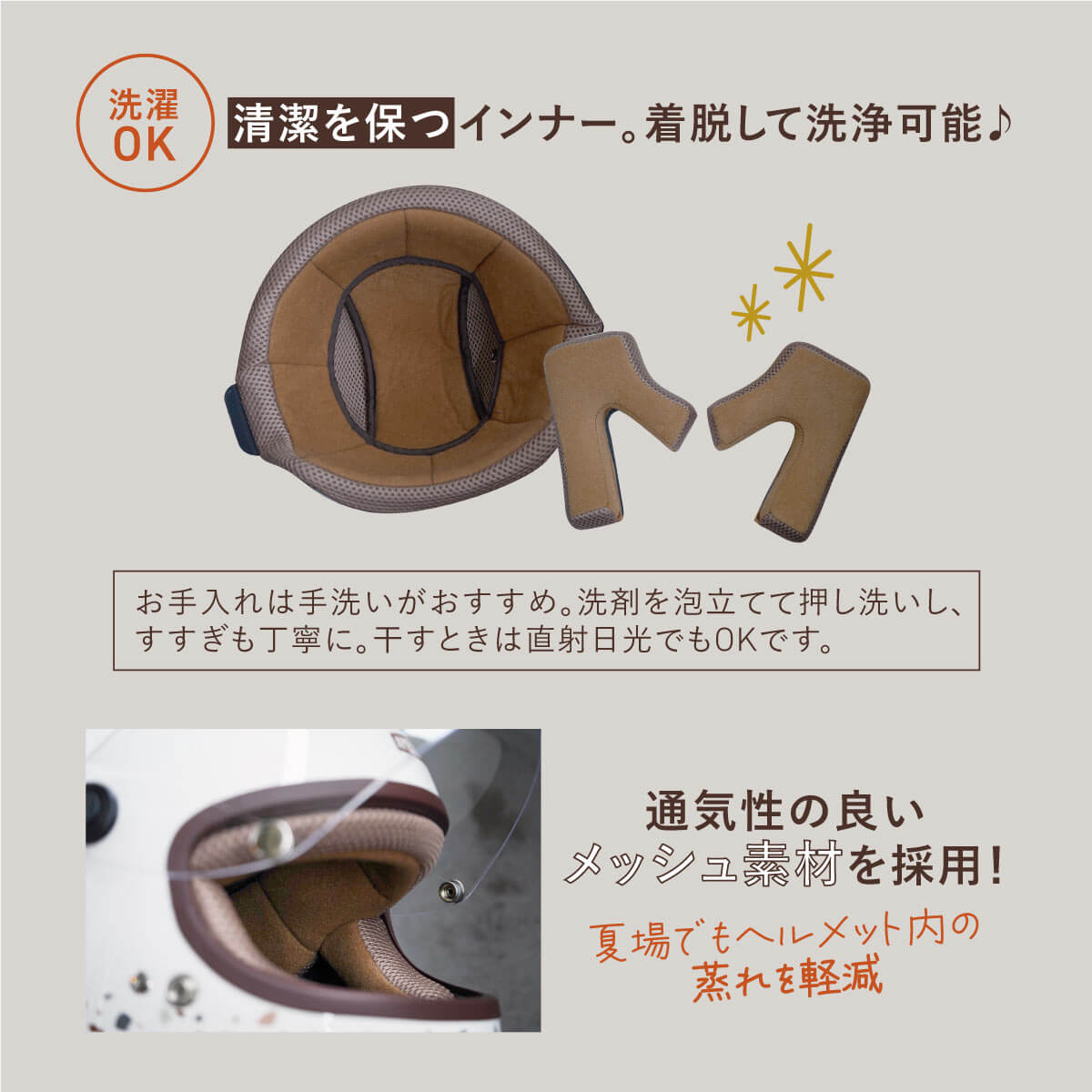 | お手入れ方法 | ・ヘルメットの外側は、やわらかい布やスポンジで優しく拭き取ります。汚れがある場合は、ぬるま湯で湿らせてから拭くと効果的です。落ちにくい汚れには中性洗剤を薄めて使用してください。シンナーやアルコールなどの強い洗剤は塗装や素材を傷めるため避けましょう。 ・シールドの汚れは水で湿らせた柔らかい布で優しく拭き取ってください。 ・内装は取り外して洗うことができます。中性洗剤を使ってぬるま湯で優しく洗い、洗濯機は使わないでください。洗ったあとは水気を取り、陰干しで乾かしてください。 完全に乾いてから取り付けましょう。 |