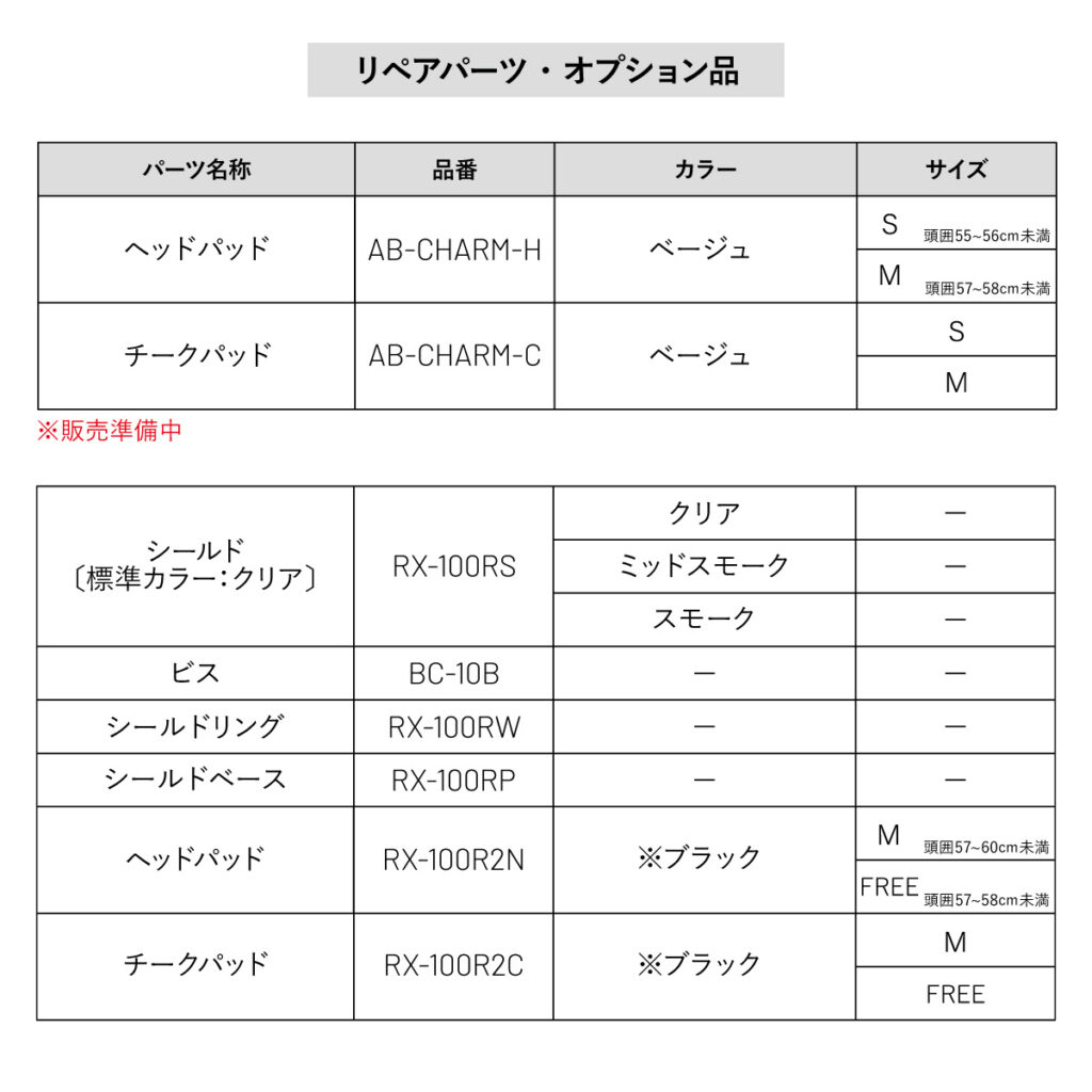 | オプション品 | AMBOOTヘッドパッド〔ベージュ〕 →後日公開 AMBOOTチークパッド〔ベージュ〕 →後日公開 シールド〔標準カラー:クリア〕 →https://item.rakuten.co.jp/lead-industry/rx-100rs ビス →https://item.rakuten.co.jp/lead-industry/bc-10b シールドリング →https://item.rakuten.co.jp/lead-industry/rx-100rw シールドベース →https://item.rakuten.co.jp/lead-industry/rx-100rp ヘッドパッド →https://item.rakuten.co.jp/lead-industry/rx-100r2n チークパッド →https://item.rakuten.co.jp/lead-industry/rx-100r2c |