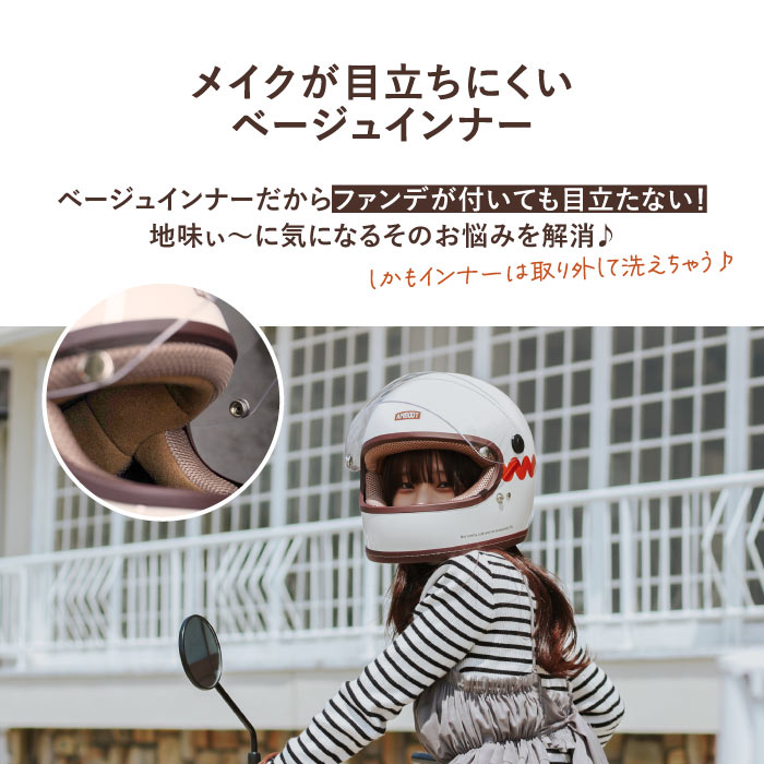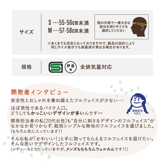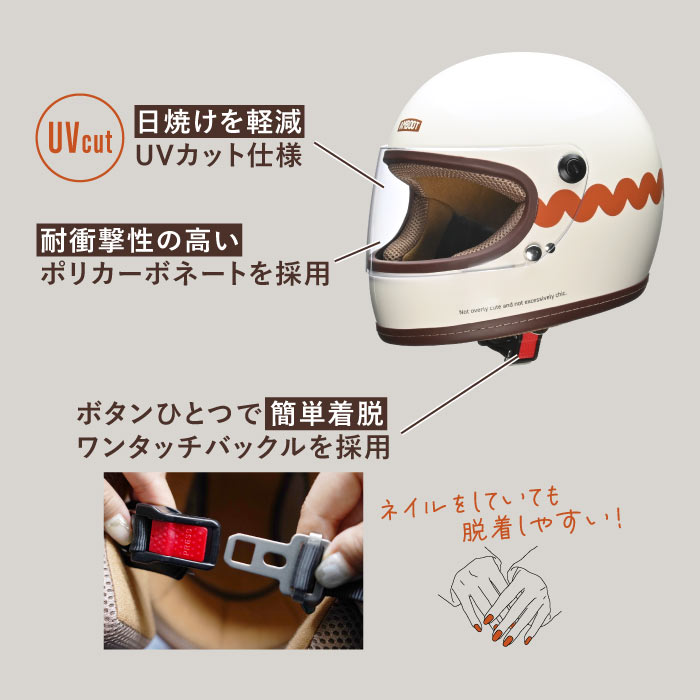 | 商品の特徴 | ◇女性目線で企画したヘルメット ◇他にはないオシャレなデザイン&カラー ◇原付から大型バイクまで全排気量に対応 ◇初心者でも安心安全のフルフェイスヘルメット ◇インナーがベージュだからファンデなどのメイクが付いても目立ちにくい ◇インナーは取り外して洗浄可能 ◇インナーの表面はメッシュ素材だから夏場でもヘルメット内の蒸れを軽減 ◇シールドには日焼けを軽減するUVカット仕様 ◇耐衝撃性の高いポリカーボネートを採用 ◇ネイルしていても着脱しやすいワンタッチバックル ◇SG規格/PSC付 |