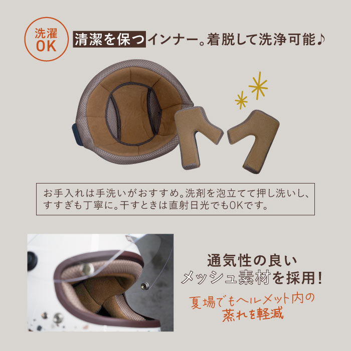 | お手入れ方法 | ・ヘルメットの外側は、やわらかい布やスポンジで優しく拭き取ります。汚れがある場合は、ぬるま湯で湿らせてから拭くと効果的です。落ちにくい汚れには中性洗剤を薄めて使用してください。シンナーやアルコールなどの強い洗剤は塗装や素材を傷めるため避けましょう。 ・シールドの汚れは水で湿らせた柔らかい布で優しく拭き取ってください。 ・内装は取り外して洗うことができます。中性洗剤を使ってぬるま湯で優しく洗い、洗濯機は使わないでください。洗ったあとは水気を取り、陰干しで乾かしてください。 完全に乾いてから取り付けましょう。 |