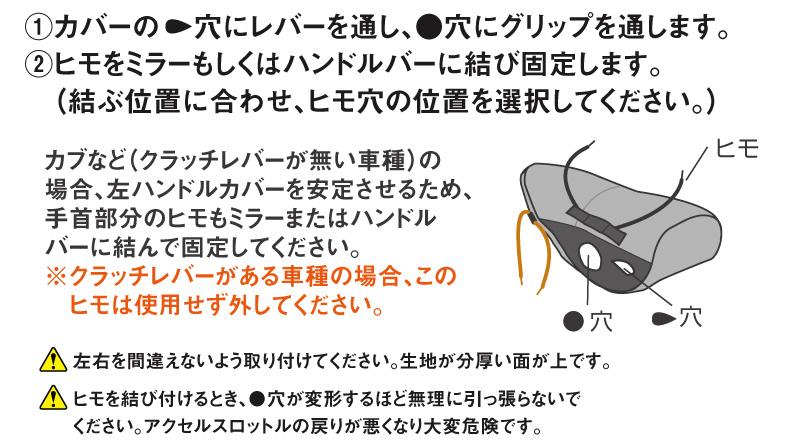 | 注意 | ・ハンドルカバーをヒモで固定するとき、各種ワイヤーを一緒に固定しないでください。アクセル、ブレーキなどのききが悪くなります。 ・本製品は一部メッシュ生地を使用しています。防水機能はございません。 ・雨ざらしや直射日光の当たる場所で放置しないでください。退色や変形、劣化の原因になります。 ・ハンドルカバーが汚れた場合、中性洗剤を含ませた布で軽く拭き取ってください。洗濯機のご使用はお避け下さい。 ・走行前に装着がしっかりされているか確認してください。ヒモが緩んでいると走行中にハンドルカバーがハンドルから抜けてしまう可能性があり大変危険です。 ・ご使用の状況、経年劣化等により、機能が損なわれましたら新しいものをお求めください。 |