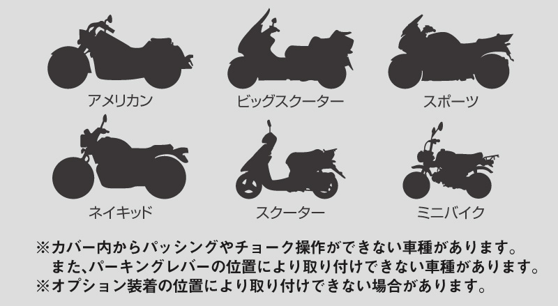 | 適応車種 | ミニバイク・スクーター・大型バイク等 |