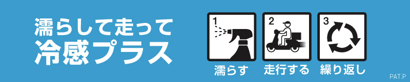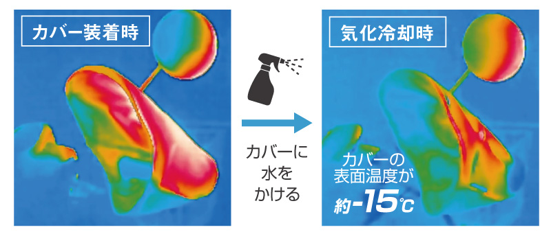水と風の気化冷却効果で強制的に手元の温度を下げることを確認。出発をためらうような暑い日は、出発前にカバー上面に水を掛けてご使用ください。