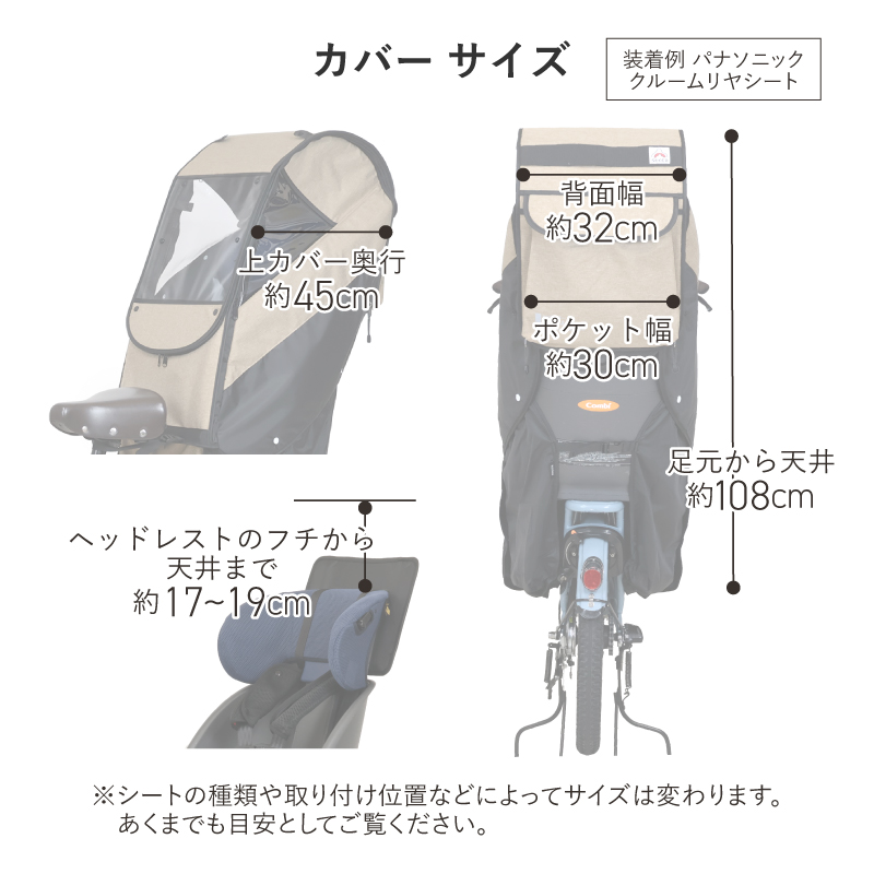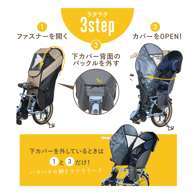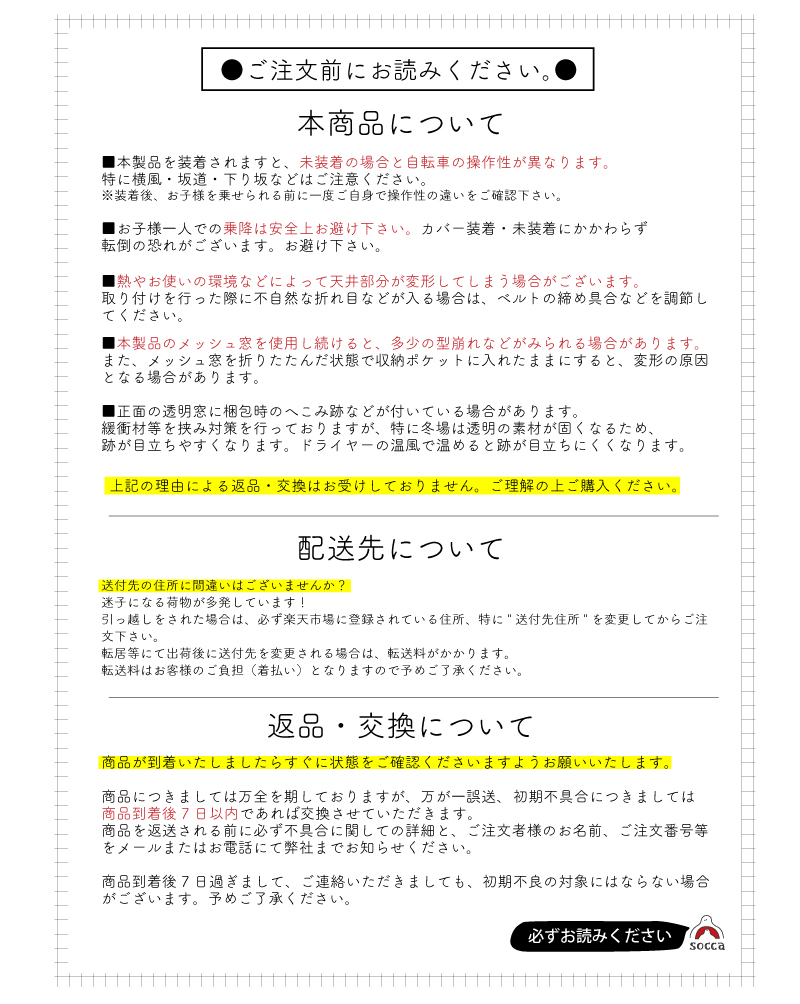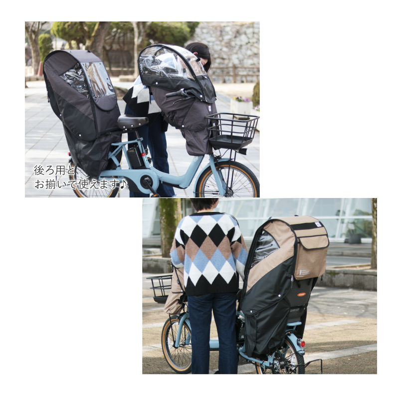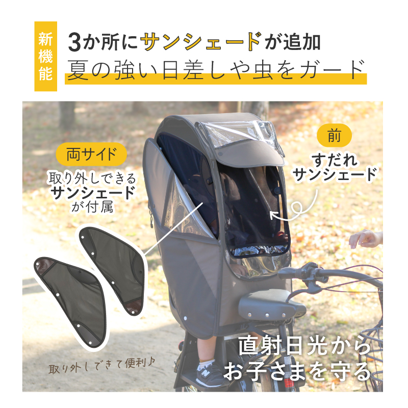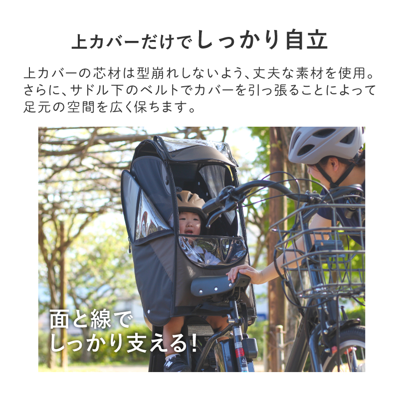 | 商品の特徴 | ・雨の日に限らず、雪の日や、寒い日の風よけとして、さらに夏の蒸し暑い日にも、ずーっと使える便利な自転車チャイルドシートレインカバー ・日差しよけになるので、紫外線対策、日焼け対策としてもご利用できます。 ・下カバーが取り外せるので、高い通気性を確保し熱中症対策としてもご利用できます。 ・手で支えなくてもカバーが開いた状態をキープ。 ・カバー側面が大きく開くから乗せ降ろしの際に頭や足が引っかかりにくい。 ・乗せ降ろしラクラク大きく開くファスナー ・検査を行い、合格した安心・安全な生地やパーツだけを使用しています。 ・カバー吹き飛び防止の工夫 ・便利な収納ポケット付き |