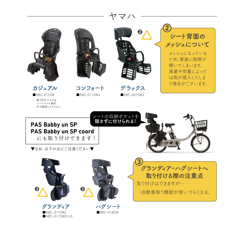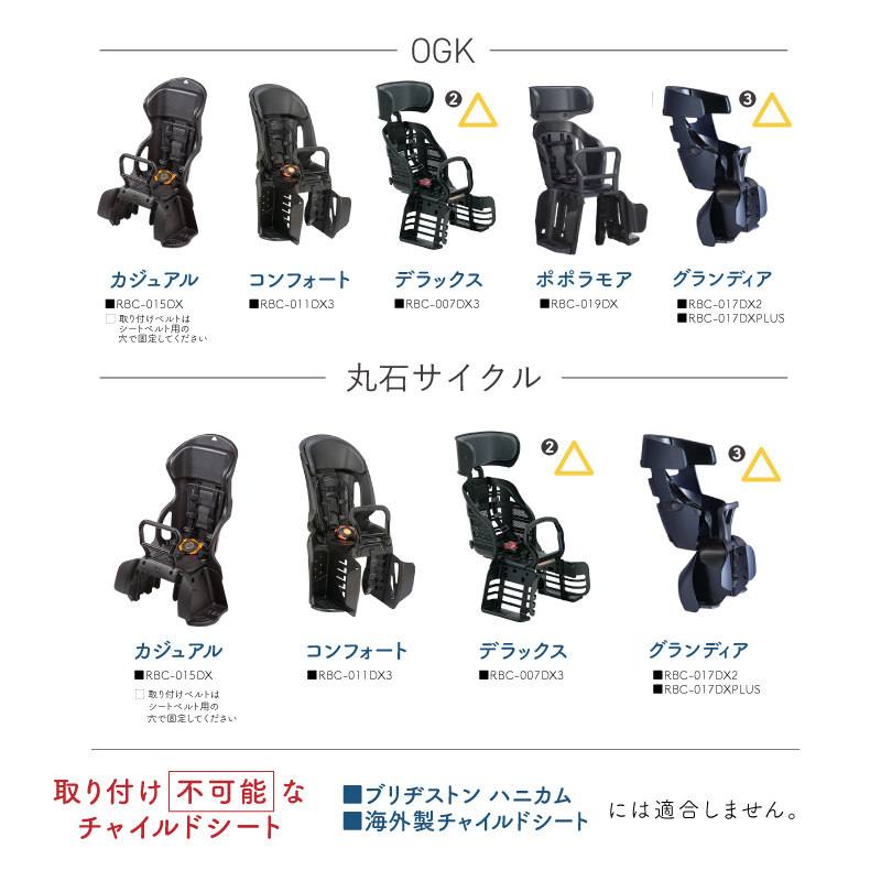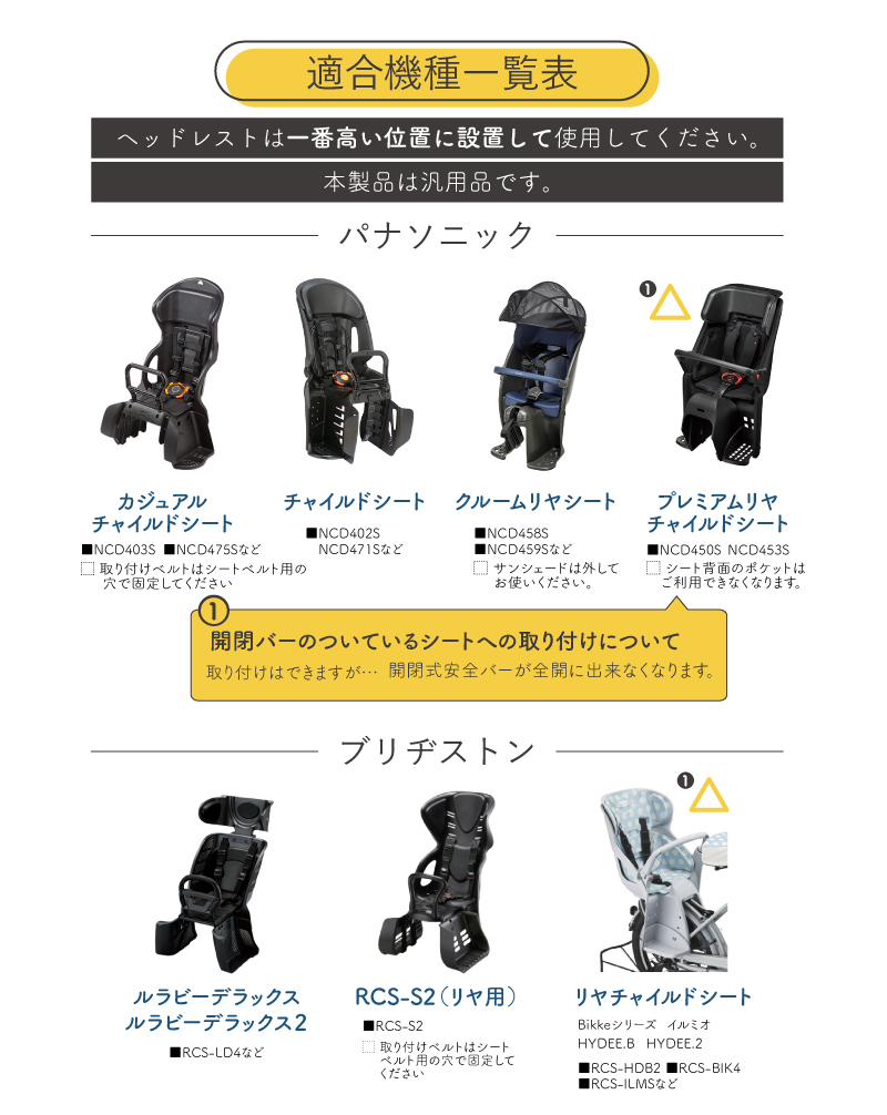 | 適合シート | 主要メーカーのヘッドレスト付き後ろ用チャイルドシートにご利用いただけます。 ブリヂストンサイクル・bridgestone/ ルラビーデラックス ルラビーデラックス2 HYDEE B HYDEE 2 RCS-S1 RCS-LD4 RCS-BIK3 RCS-BKS3 RCS-BKS4 RCS-ILMS RCS-BKS2 Bikke ビッケ パナソニック・panasonic/ NCD363AS NCD403S NCD402S NCD426S NCD437S NCD450S NCD453S NCD454S NCD455S NCD458S NCD459S NCD475S NCD472S NCD471S PRBC-001DX NCD337AS、NCD415S、NCD403S NCD363S NCD366AS~NCD372AS NCD382AS~NCD388AS ギュットアニーズEX ギュットアニーズDX ギュットアニーズKD ギュットアニーズF・DX ギュットミニKD ギュットミニDX ギュットミニEX gyutto mini ギュット・クルームR・EX(サンシェードの併用不可) ギュット・クルームR・DX(サンシェードの併用不可) ヤマハ・YAMAHA/ パスバビー パスバビーアン PAS Babby un SP coord PAS Babby un SP PAS Babby un PAS kiss PAS kiss mini un PAS Kiss mini un SP PAS Crew PAS Raffini デラックス RBC-007DX3 コンフォート RBC-011 カジュアル RBC-015DX グランディア RBC-017DX RBC-017DX2 RBC017DX PLUS ハグシート ヤマハパスバビーアンSP※PASシリーズの後ろ用シートについては適合表の「グランディアへの適合について」をご覧ください。 丸石サイクル・maruishi/ ふらっかーずオプションシート ふらっか〜ず アシストミニ アシスト ココッティ プリミア シュシュ スティーナ キュート キュートミニ、デラックス RBC-007DX3 コンフォート RBC-011 カジュアル RBC-015DX グランディア RBC-017DX OGK製品/ RBC-011DX3 コンフォート RBC-007DX3 デラックス RBC-015DX カジュアル RBC-009DXS グランディア RBC-017DX RBC-017DX2 RBC017DX PLUS |