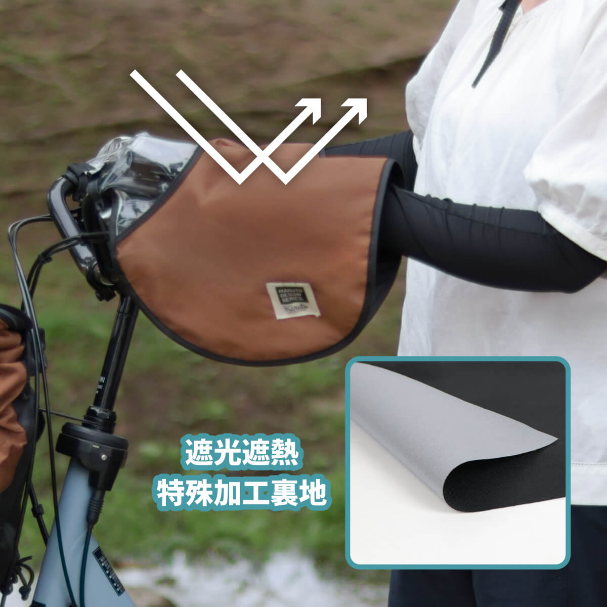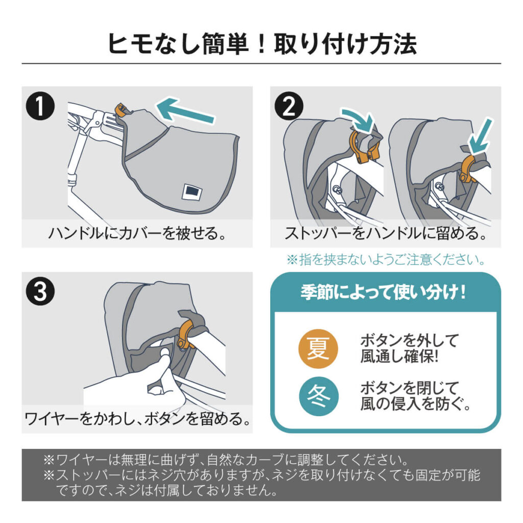 | 注意 | ・本製品は完全防水ではありません。 ・経年による部品や生地の劣化が見られましたら、新しい製品にお取替えください。 ・長時間、炎天下に放置しないでください。紫外線や酸性雨など自然現象で耐久性が損なわれます。 ・火気の近くでは使用しないでください。難燃性はありません。 ・小さなお子様がかぶって遊んだりしないよう、十分ご注意ください。 ・自然光及び、照明などにより、通常のご使用でも変退色は避けられません。ご了承ください。 ・濡れたままで保管はしないでください。カビ及び色落ちの原因となる場合があります。 ・濡れた場合はハンドルから取り外し、日陰で干してからお使いください。 ・ハンドルカバー本体が汚れた場合、中性洗剤を含ませた布で軽く汚れを拭き取ってください。 ・紫外線や酸性雨による、若干の変退色は避けられません。ご了承ください。 ・市販の防水スプレーをご使用いただくと、より長くお使いいただけます。(防水スプレーをご利用の際、透明部分にはかからないようにしてください。変色の原因となります。) |