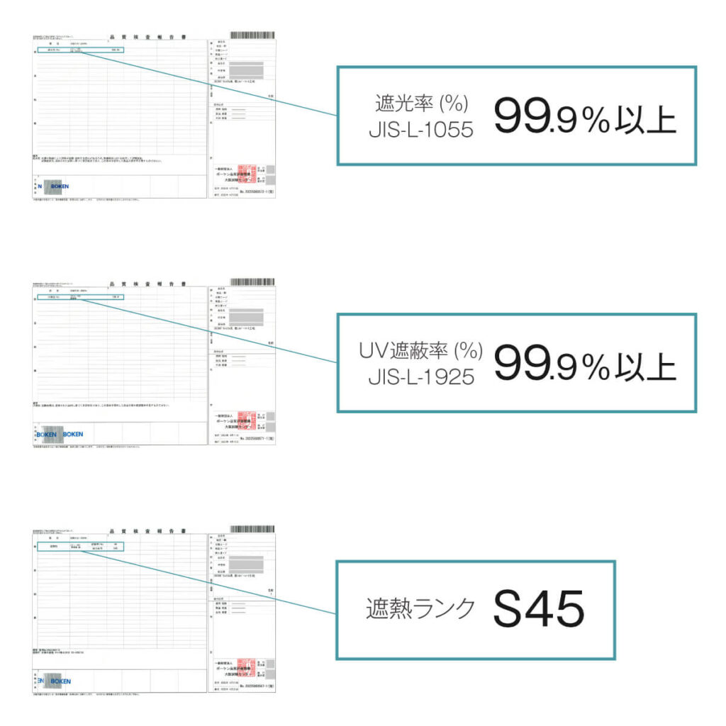 国内の検査機関で正式に認められた、99.9%を超える遮光性と遮熱率!また、遮熱ランクはS45と、遮熱性能が優れています。