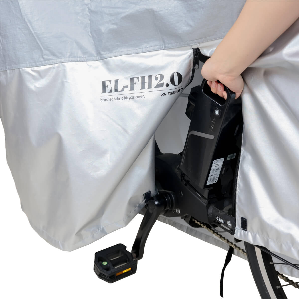中央ファスナーを使用すれば、カバーをめくりあげることなく立ったままスムーズにバッテリー交換をすることが可能です。