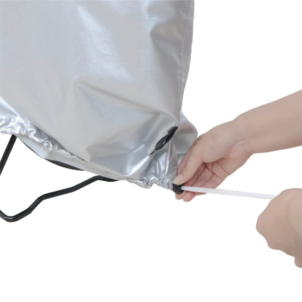 | 注意 | ●火気の近くでは、ご使用しないでください。本製品は不燃性ではありません。 ●濡れた状態で放置しておくと劣化を促進することにつながりますので、こまめにカバーを干してお使いください。 ●洗濯機及び、もみ洗いはお避けください。汚れは水またはぬるま湯で洗い流してください。 ●紫外線や酸性雨などの自然現象及び使用状況で耐久性が損なわれることがあります。長期間炎天下や雨ざらしでのご使用はお避けください。経年による劣化や破れが見られましたら、新しい製品にお取替えください。 ●鋭利な突起物などで引っかいたりしないでください。 ●小さなお子様が被って遊んだりしないよう、十分ご注意ください。 ●本製品は盗難防止も目的としておりますが、完全に防げるものではありません。 ●本製品は完全防水ではありません。 |