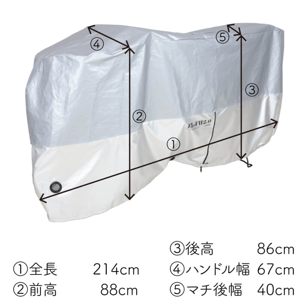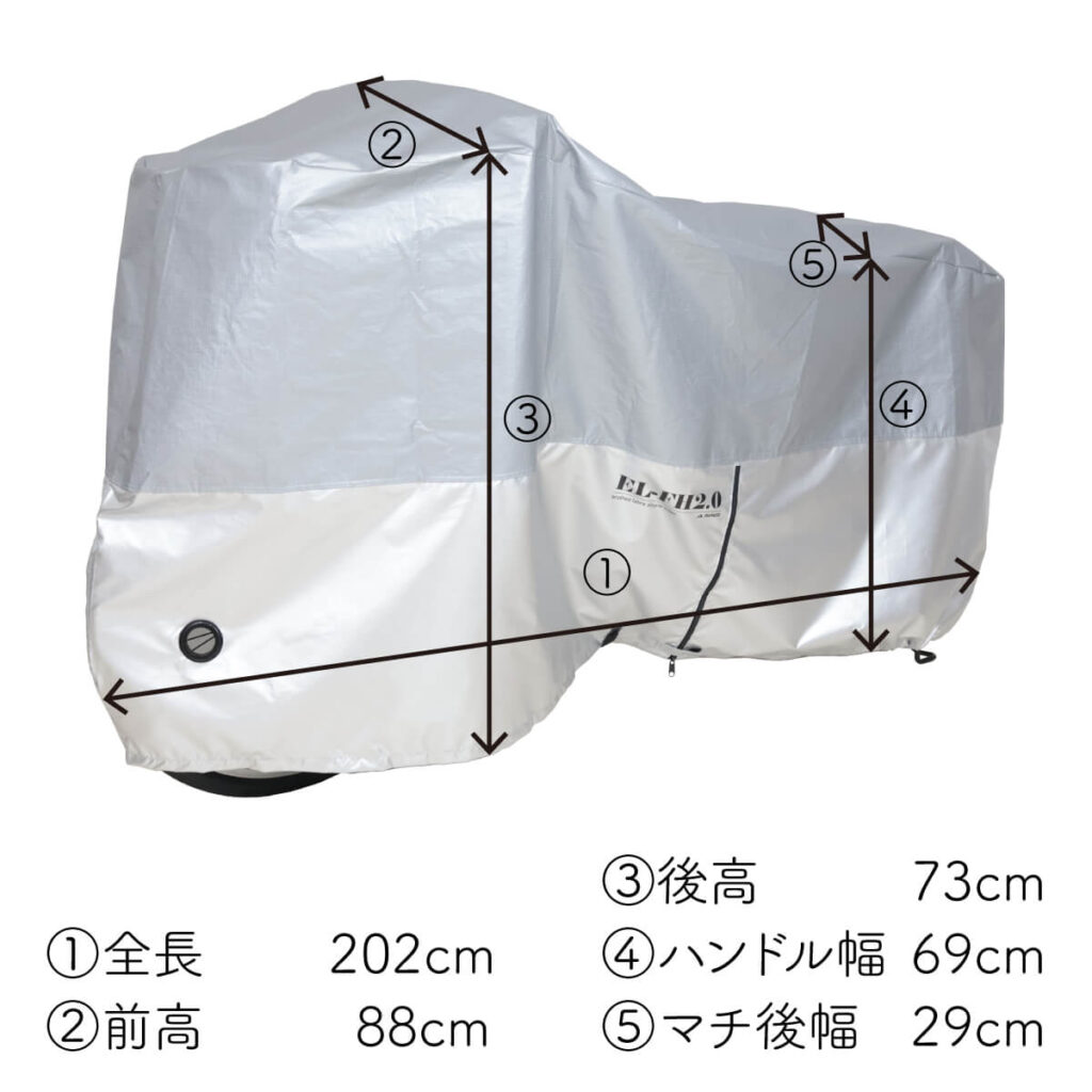 | 商品の特徴 | ・中央のハーフファスナーでかけやすい ・上部生地は車体を守る裏起毛、下部生地は絞りやすい150Dシルバー。 ・上部は超音波加工で溶着しているので、防水性に優れています。 ・内径38mmのアイレットがついており大型ロックにも対応します。 ・センターの面ファスナー、リアの絞り機能で風によるバタつきや裾のめくれを防ぎます。 |