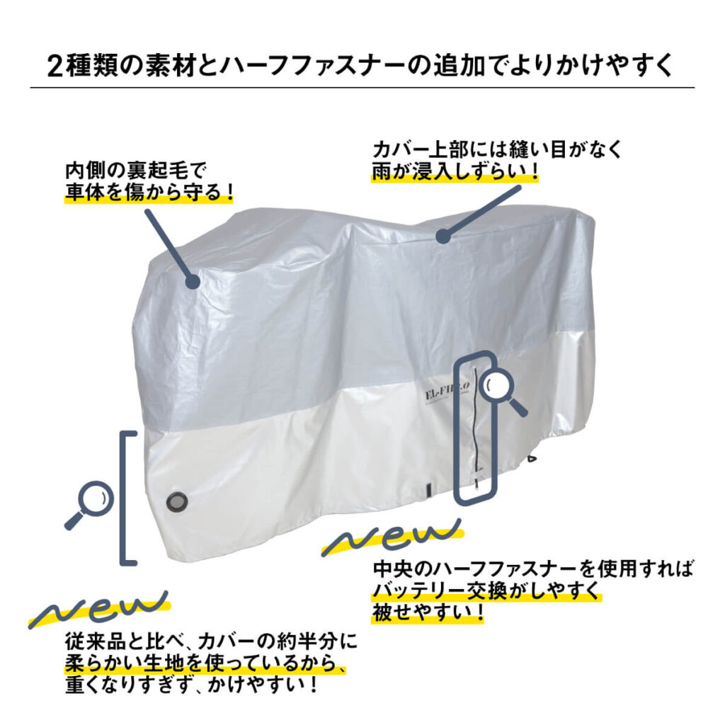 カバーの半分は柔らかい生地で、重くなりすぎないから車体にかけやすい。