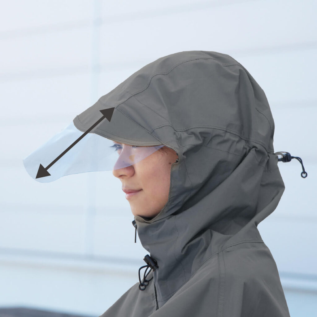 カクカク立体構造のツバが、顔の横の空間を広げて、顔にフードが付きにくくしてくれます。