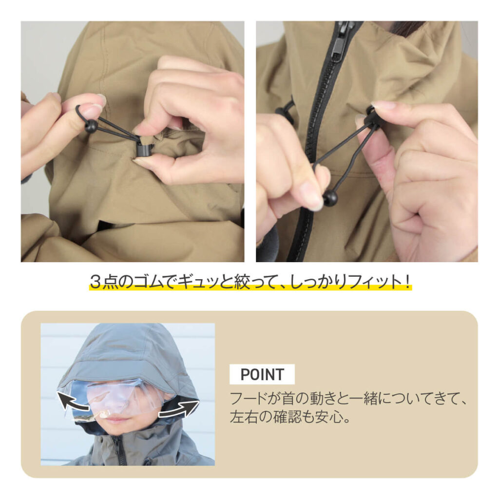 左右・後ろのゴムで、フードのフィット感を調整可能。道路状況を確認する際も、フードが邪魔になりにくくなっています。