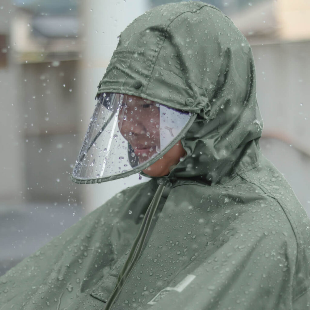 しっかりとした硬質素材のバイザーが、顔を雨からガードしてくれます。