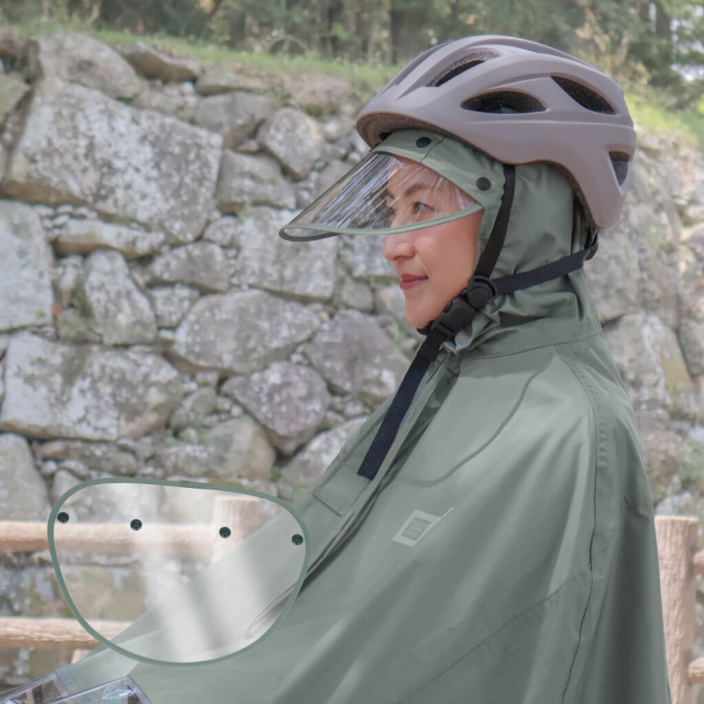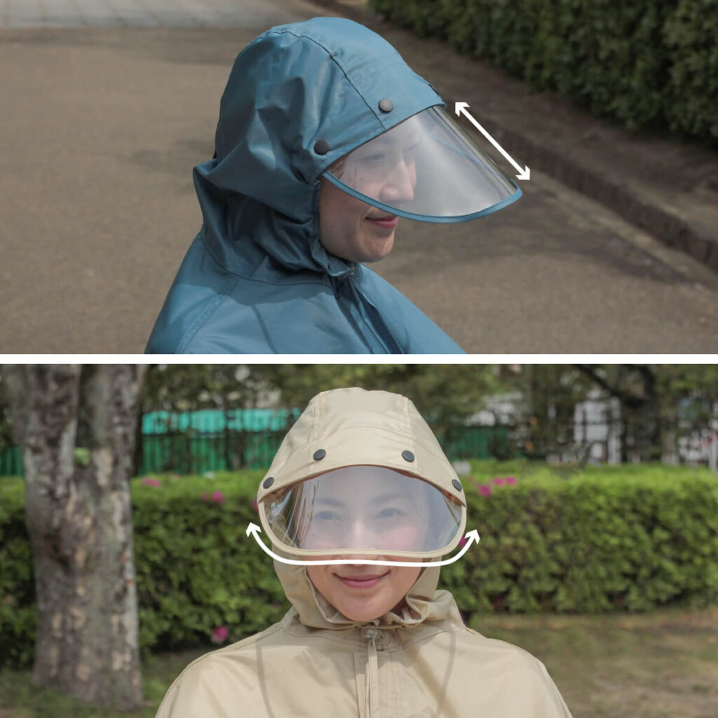 雨が降っても視界が悪くなりにくい、透明度の高い素材を使用。バイザーのスナップボタンは髪が引っかからない特殊構造で、安心してフードを着脱できます。