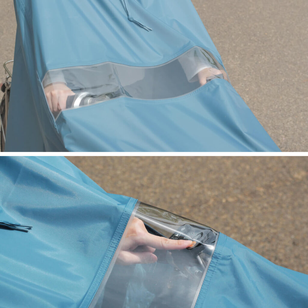 手元部分が透明なので、ポンチョを脱がずにスイッチパネルや変速の操作がしやすい。