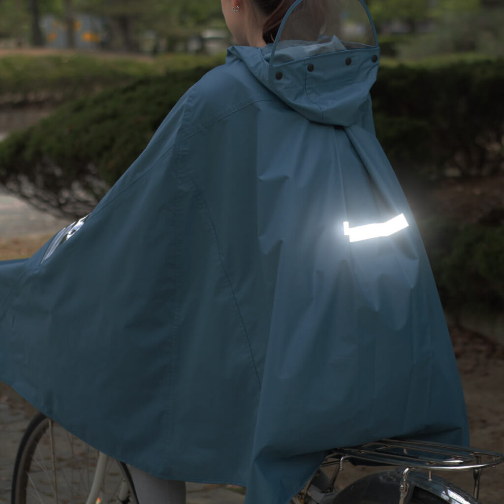 ポンチョの胸元と背中には反射マークが付いており、夜間でも視認されやすく安全です。
