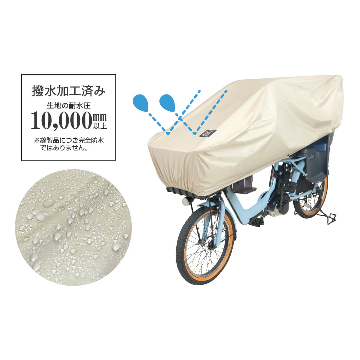 撥水加工済みの耐水圧1,0000mmの生地が、駐輪時の雨からサドルやチャイルドシートを守ってくれます。