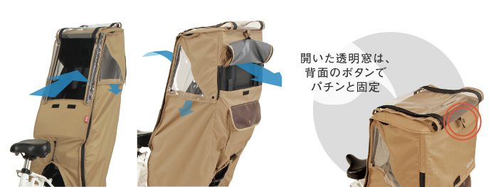 ※側面のファスナー(お子様を乗せ降しするファスナー)を開いたままでの走行は絶対にしないでください。走行中にカバーが外れたり車輪に巻き込まれる恐れがあり大変危険です。