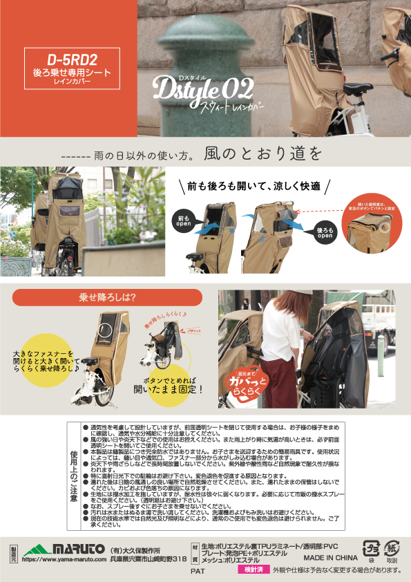 | 注意 | ・本製品はお子さまの送迎を目的とする簡易雨具です。他の目的で使用しないでください。 ・通気性を考慮して設計していますが、透明カバーを被せて使用する場合はお子さまの様子をまめに確認し、通気や水分補給に十分注意してください。また、お子さまをカバー内に残したまま短時間でも離れないでください。停車時にカバー内が高温になることがあります。 ・走行前には必ず各パーツが外れていないか確認してください。特にカバー取付部に緩みがないか確認してください。そのまま放置して走行すると、カバーのスソなどが車輪に巻き込まれる恐れがあり大変危険です。 ・側面のファスナー(お子様を乗せ降しするファスナー)を開いたままでの走行は絶対にしないでください。走行中にカバーが外れたり車輪に巻き込まれる恐れがあり大変危険です。 ・本製品は完全防水ではありません。使用状況によっては縫い目や通気口から多少雨水が浸入することがあります。 ・濡れたあとは日陰の風通しのよい場所で自然乾燥させてください。 ・生地には撥水加工を施していますが、徐々に弱くなります。必要に応じて市販の撥水スプレーをご使用ください。(透明カバーはお避けください。)なお、スプレー後すぐにお子さまを乗せないでください。 |
