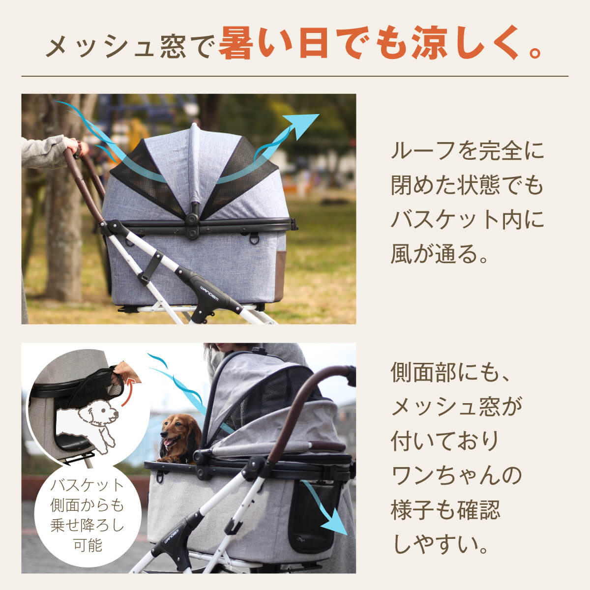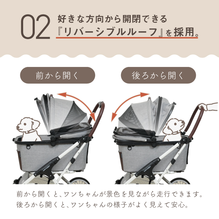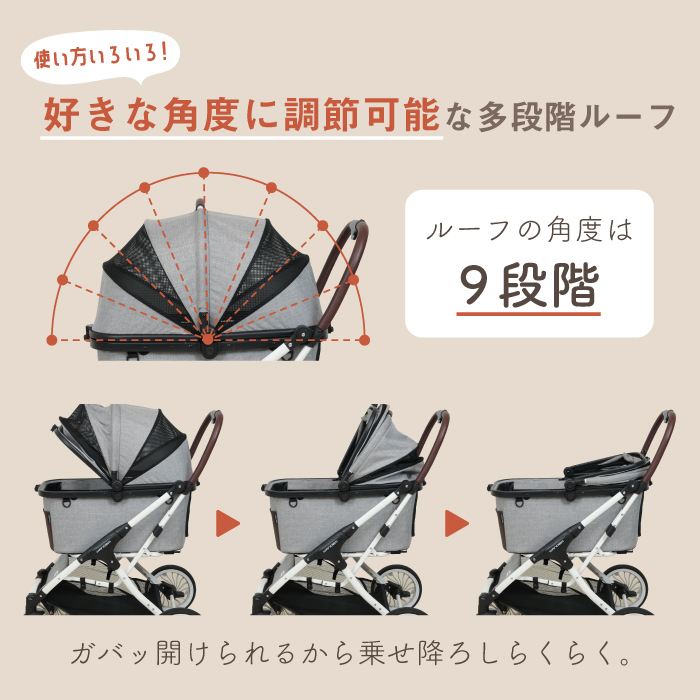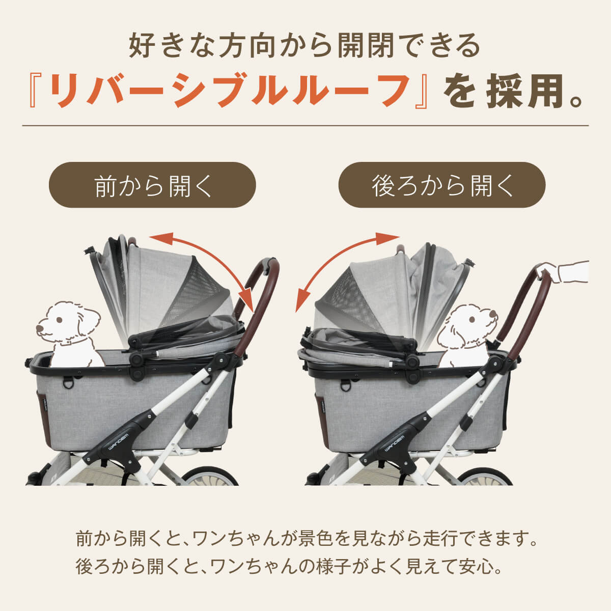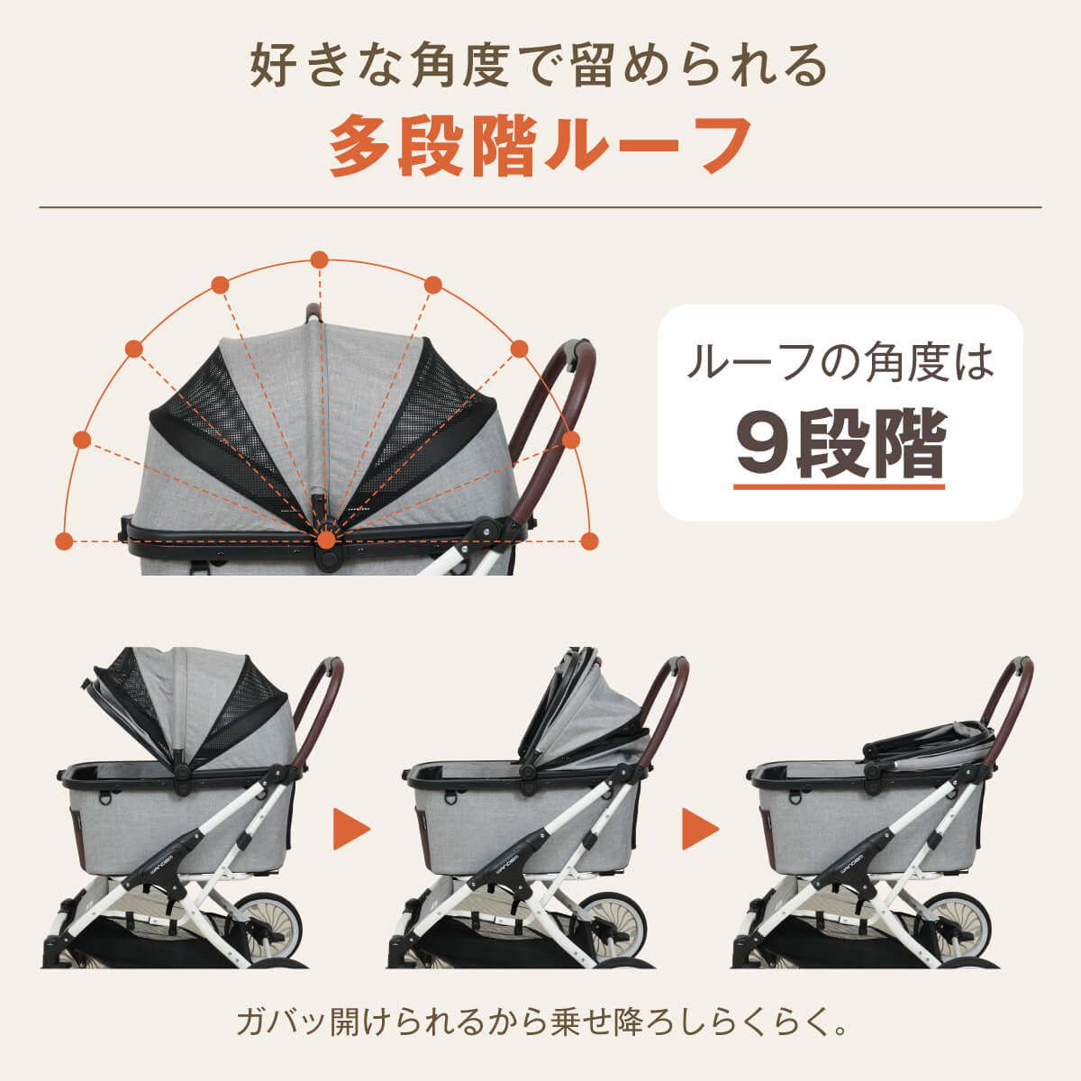 | 商品の特徴 | ・好きな方向から開閉できるリバーシブルルーフ ・好きな角度に調節可能な多段階ルーフ ・誰でも簡単、10秒で組み立てできる ・前後問わずに取り付けできるバスケット ・厚手のクッションで移動中も心地いい ・3か所のメッシュ窓で暑い時期も涼しく ・お散歩グッズを装着できる |