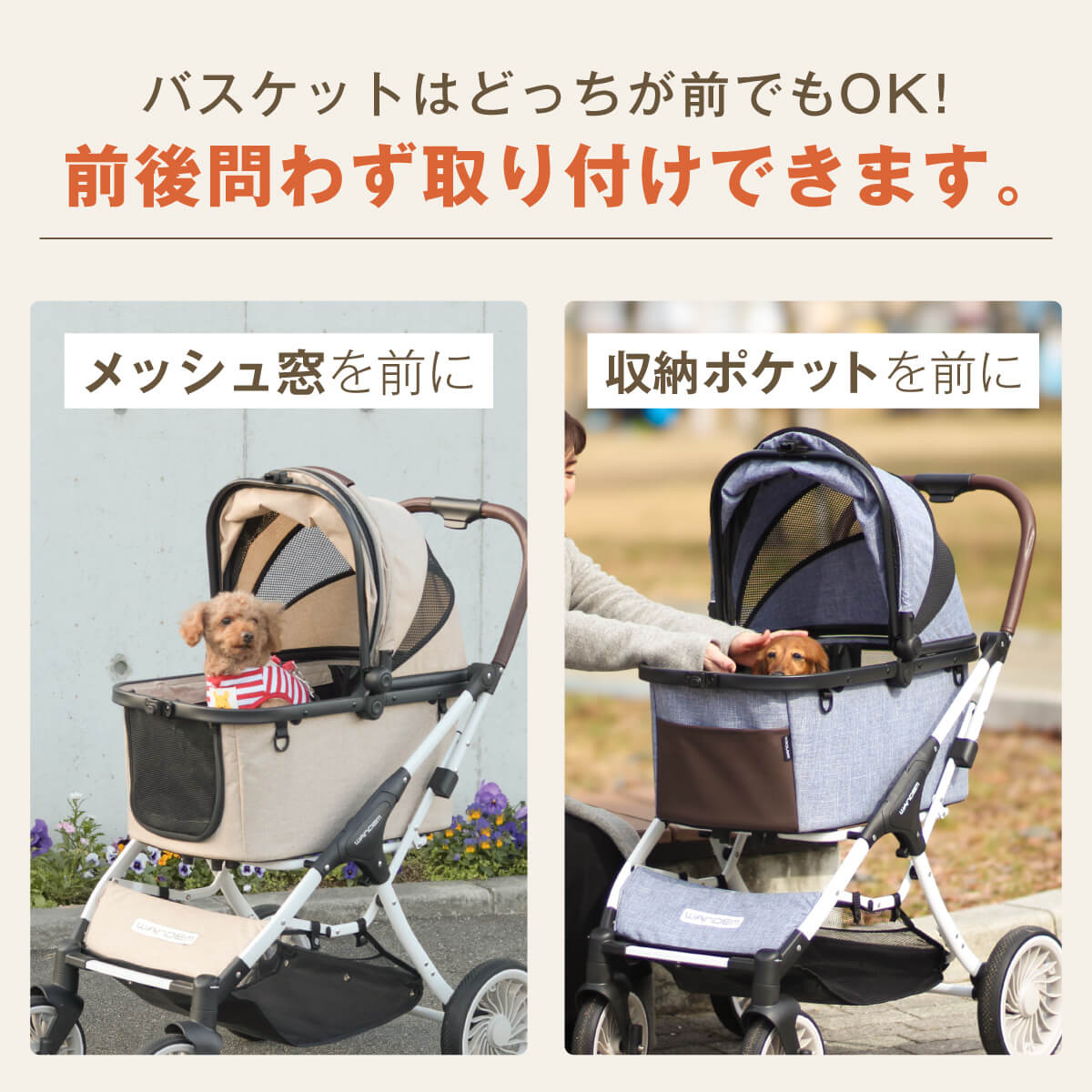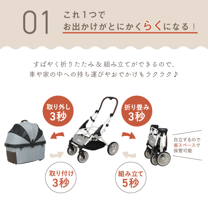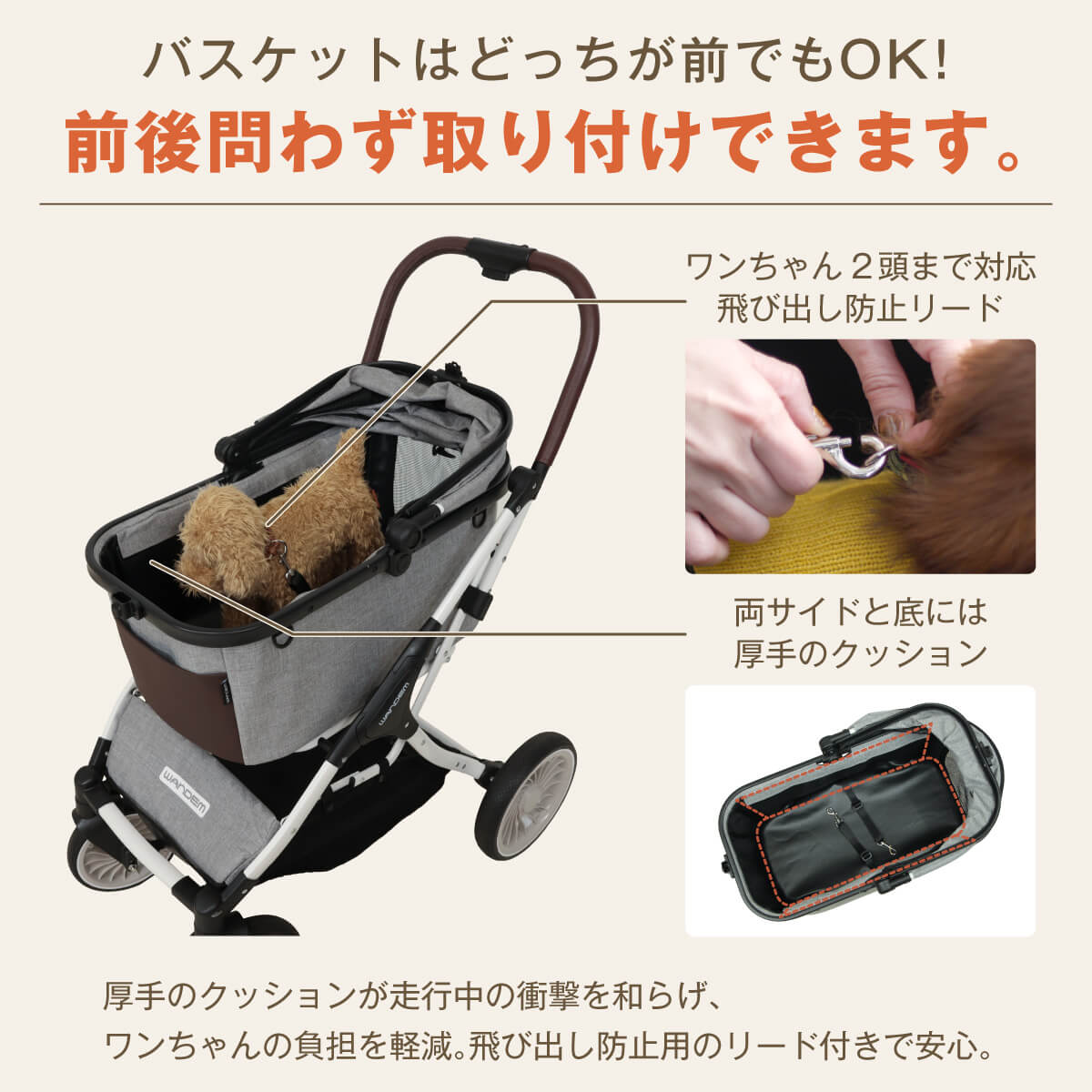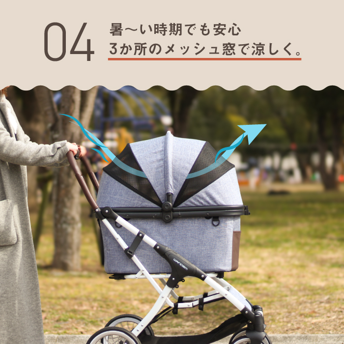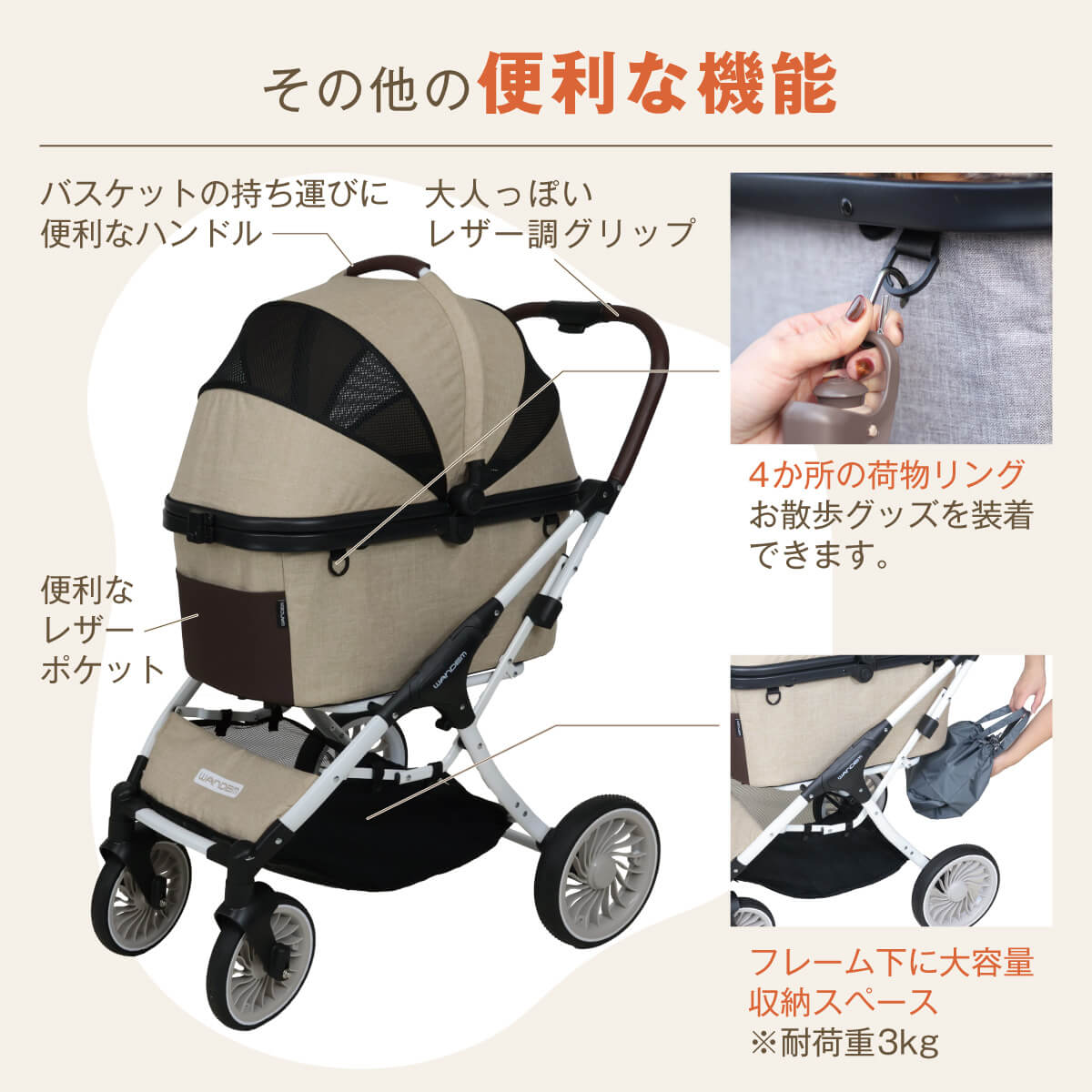 | 商品の特徴 | ・好きな方向から開閉できるリバーシブルルーフ ・好きな角度に調節可能な多段階ルーフ ・誰でも簡単、10秒で組み立てできる ・前後問わずに取り付けできるバスケット ・厚手のクッションで移動中も心地いい ・3か所のメッシュ窓で暑い時期も涼しく ・お散歩グッズを装着できる |