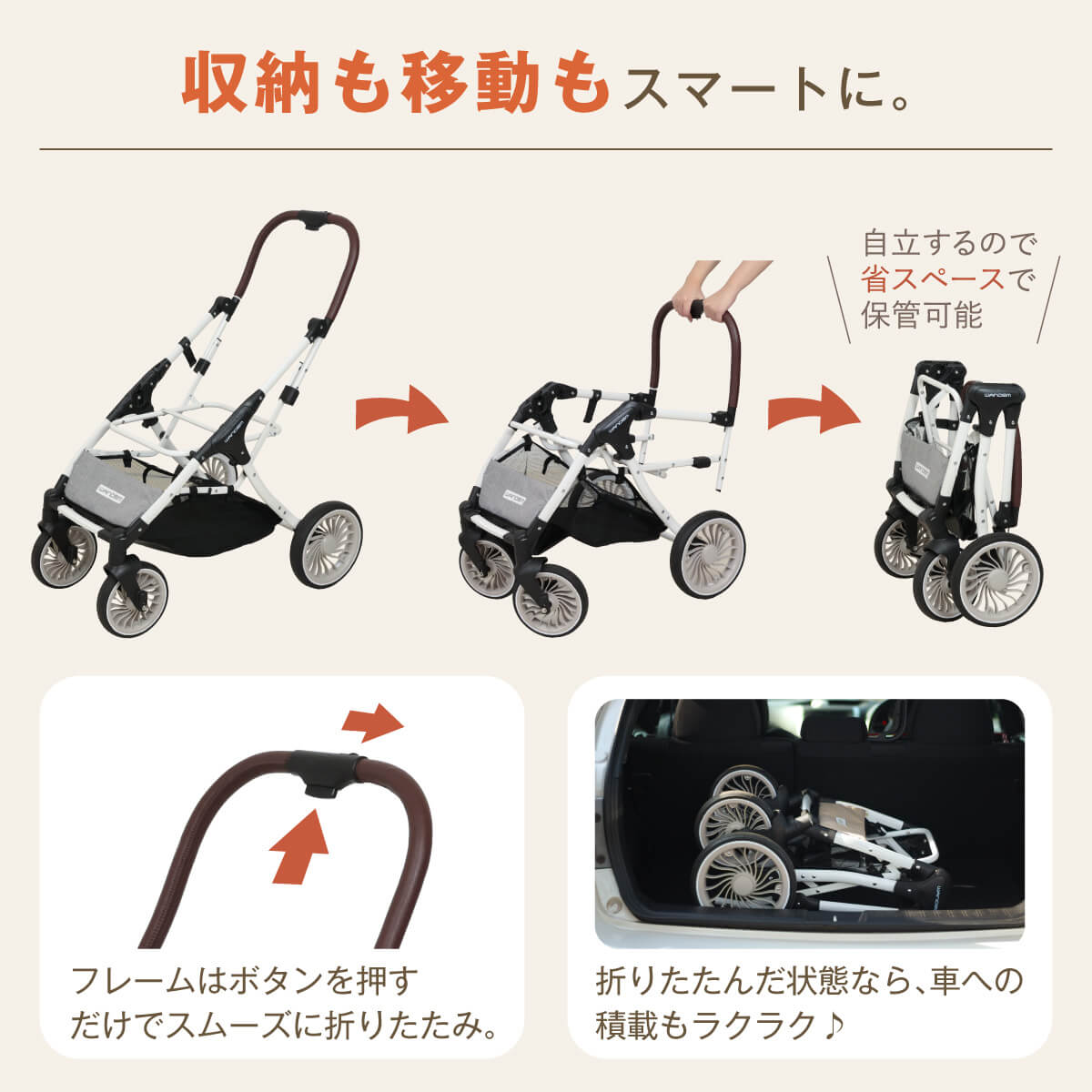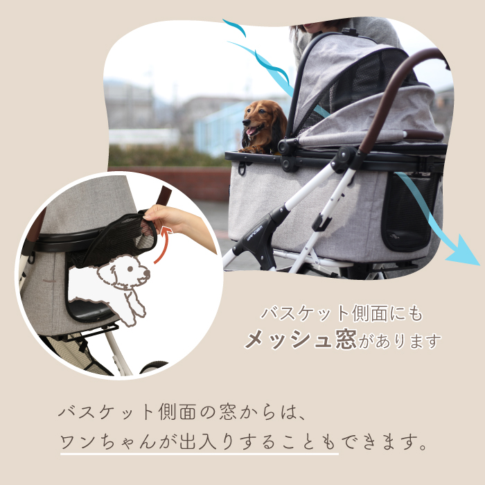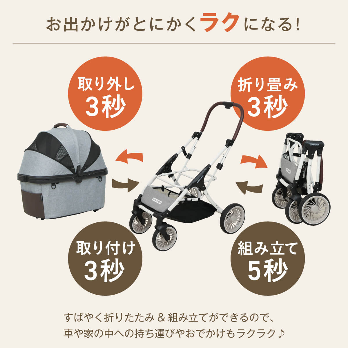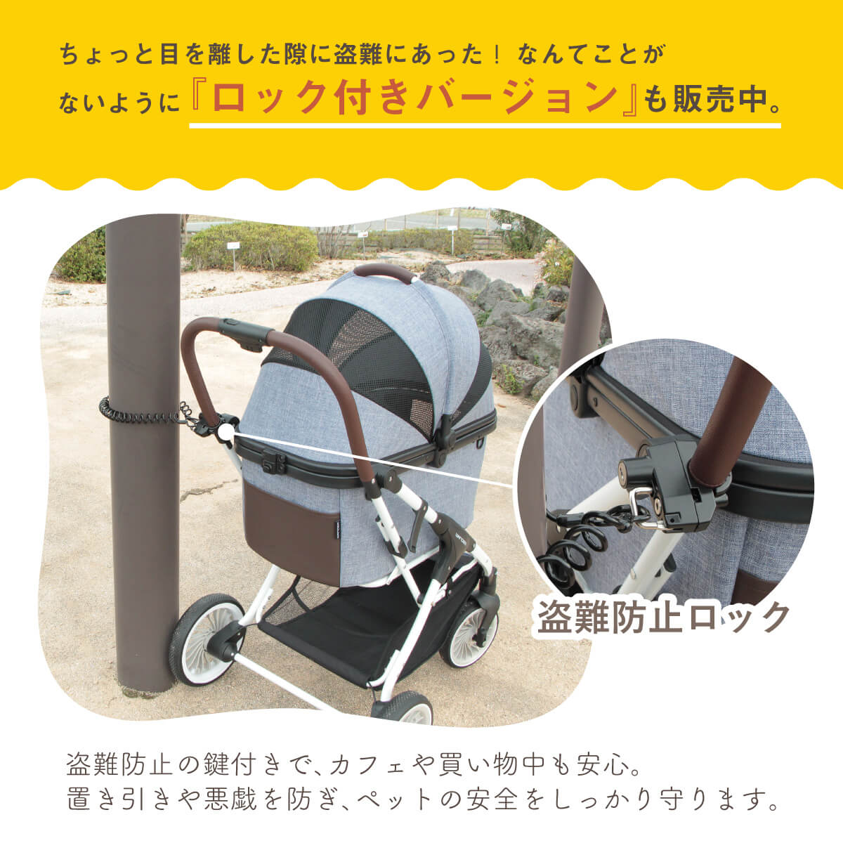 | 商品の特徴 | ・好きな方向から開閉できるリバーシブルルーフ ・好きな角度に調節可能な多段階ルーフ ・誰でも簡単、10秒で組み立てできる ・前後問わずに取り付けできるバスケット ・厚手のクッションで移動中も心地いい ・3か所のメッシュ窓で暑い時期も涼しく ・お散歩グッズを装着できる |