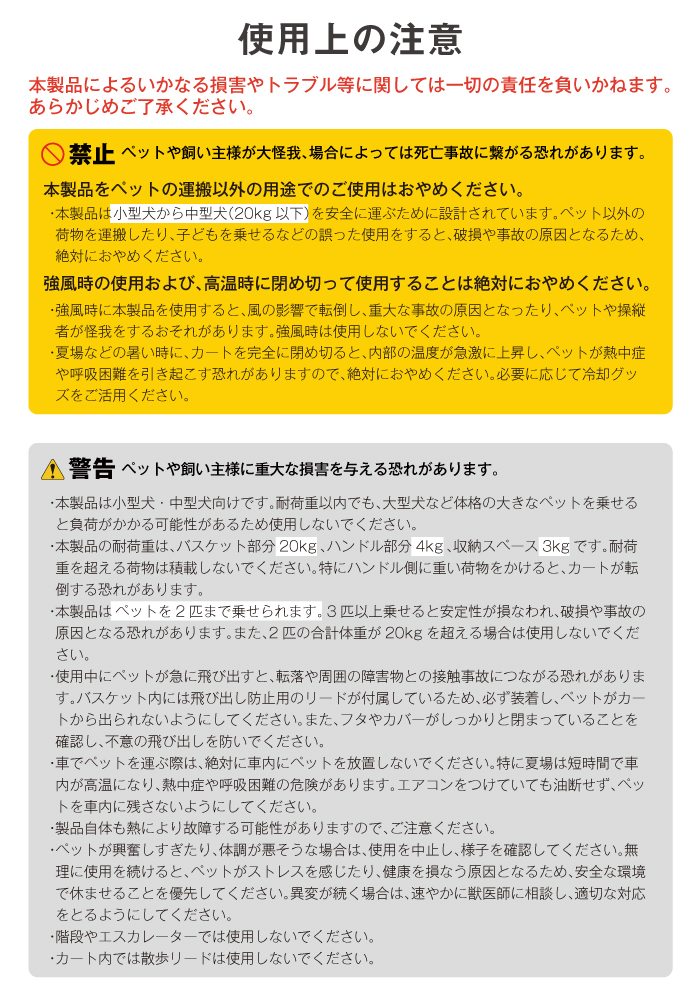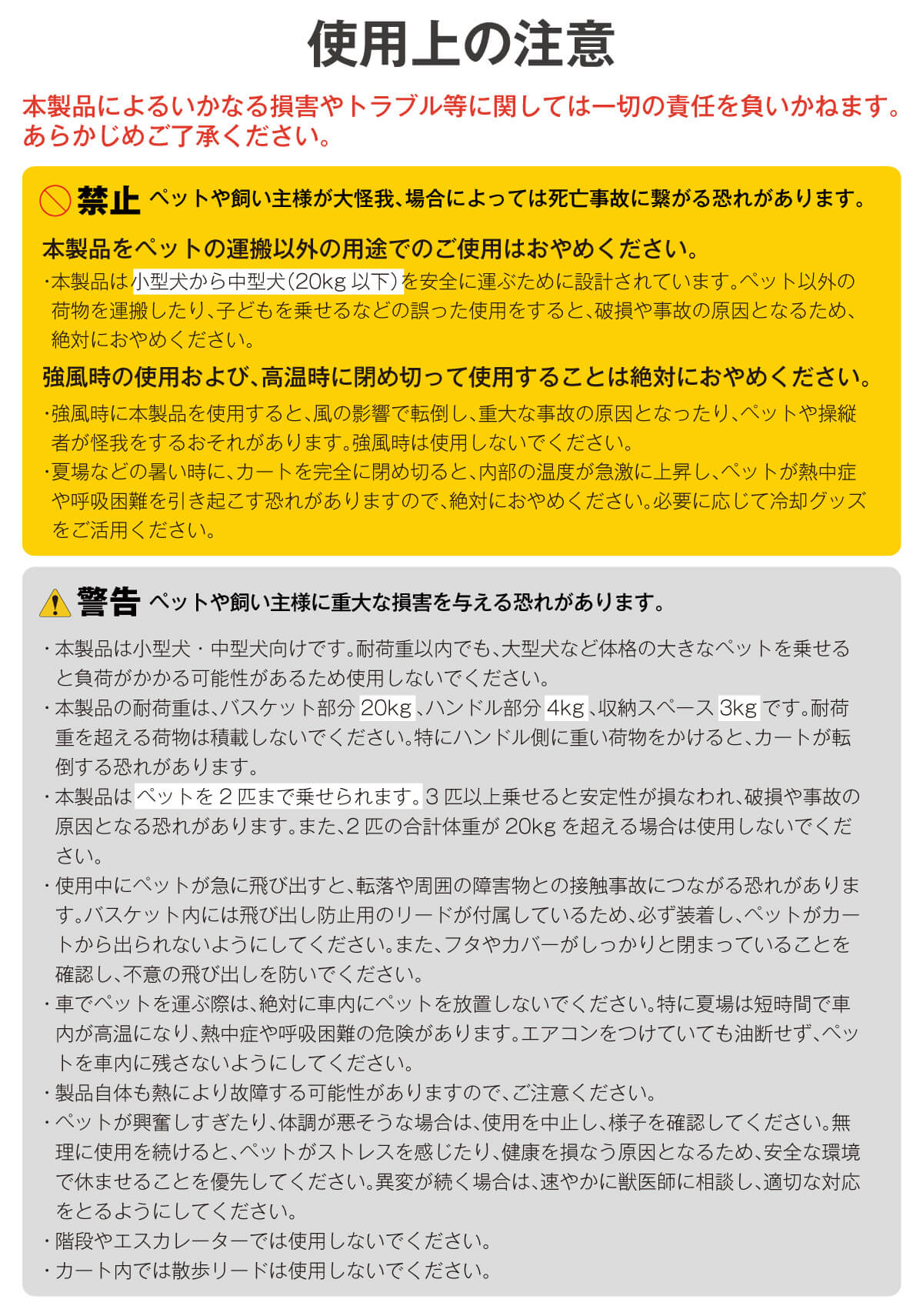 | 注意 | ●本製品によるいかなる損害やトラブル等に関しては一切の責任を負いかねます。 あらかじめご了承ください。 ●強風時の使用および、高温時に閉め切って使用することは絶対におやめください。 ●強風時に本製品を使用すると、風の影響で転倒し、重大な事故の原因となったり、ペットや操縦者が怪我をする可能性があります。強風時は使用しないでください。 ●夏場などの暑い時に、カートを完全に閉め切ると、内部の温度が急激に上昇し、ペットが熱中症や呼吸困難を引き起こす恐れがありますので、絶対におやめください。必要に応じて冷却グッズを活用してください。 ●本製品をペットの運搬以外の用途でのご使用はお控えください。 ●本製品は小型犬から中型犬(20kg以下)を安全に運ぶために設計されています。ペット以外の荷物を運搬したり、子どもが乗るなどの誤った使用をすると、破損や事故の原因となるため、絶対におやめください。 ●本製品の耐荷重は、バスケット部分20kg、ハンドル部分4kg、収納スペース3kgです。耐荷重を超える荷物は積載しないでください。特にハンドル側に重い荷物をかけると、カートが転倒する恐れがあります。 ●本製品は小型犬・中型犬向けです。耐荷重以内でも、大型犬など体格の大きなペットを乗せると負荷がかかる可能性があるため使用しないでください。 ●本製品はペットを2匹まで乗せられます。3匹以上乗せると安定性が損なわれ、破損や事故の原因となる恐れがあります。また、2匹の合計体重が20kgを超える場合も、1台のカートに乗せないでください。 ●走行中や停車時にペットが急に飛び出すと、転落や周囲の障害物との接触事故につながる恐れがあります。バスケット内には飛び出し防止用のリードが付属しているため、必ず装着し、ペットがカートから出られないようにしてください。また、フタやカバーがしっかりと閉まっていることを確認し、不意の飛び出しを防いでください。 ●車でペットを運ぶ際は、絶対に放置しないでください。特に夏場は短時間で車内が高温になり、熱中症や呼吸困難の危険があります。エアコンをつけていても油断せず、ペットを車内に残さないようにしてください。なお、製品自体も熱により故障する可能性がございますので、ご注意ください。 ●ペットが興奮しすぎたり、体調が悪そうな場合は、使用を中止し、様子を確認してください。無理に使用を続けると、ペットがストレスを感じたり、健康を損なう原因となるため、安全な環境で休ませることを優先してください。異変が続く場合は、速やかに獣医師に相談し、適切な対応をとるようにしてください。 ●本製品は愛犬の安全と健康そして運転者の安全を保障するものではございません。 |