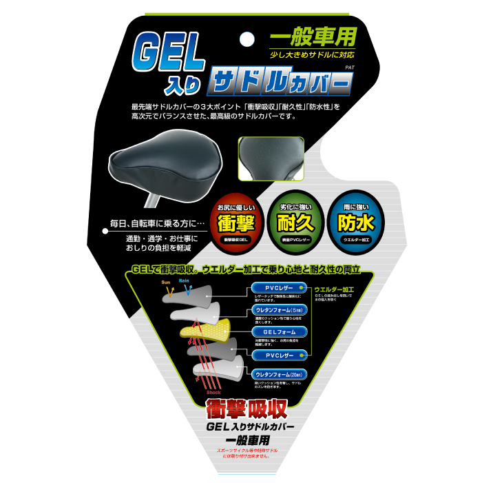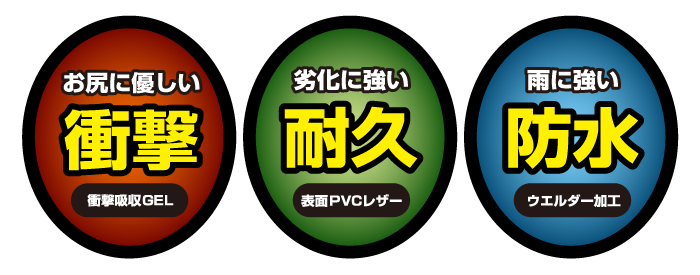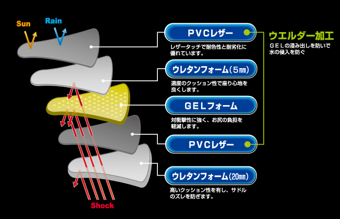 | 商品の特徴 | ・ウエルダー加工でサドルカバー内にゲルを封入 ・GELが入っているためお尻が痛くない ・劣化に強いPVCレザーを使用 ・サドルの破損やイタズラでの傷に即対応 ・雨に強い |