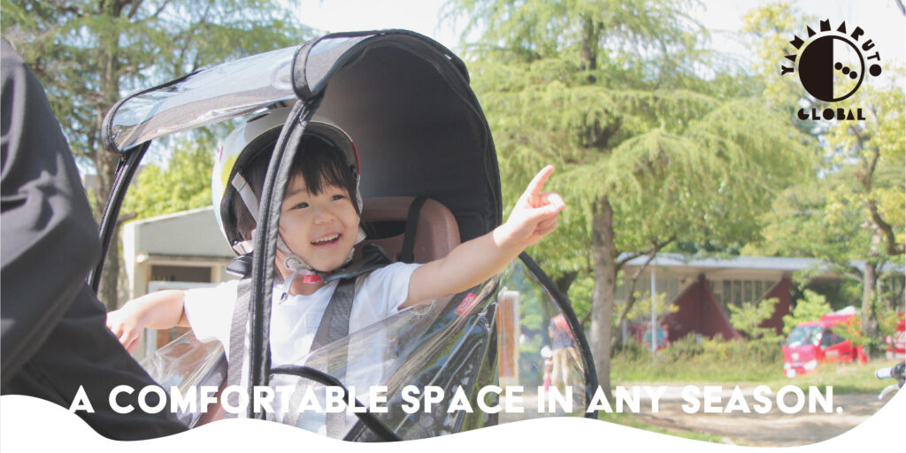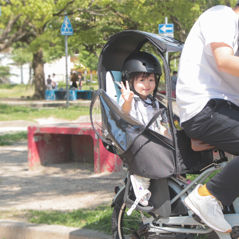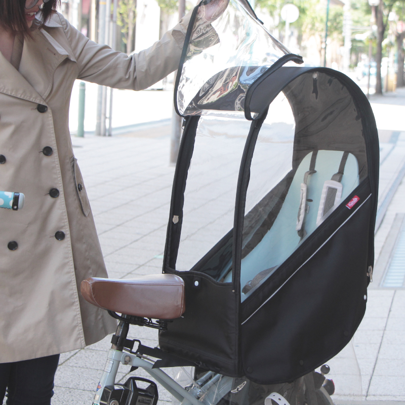 | Use | ・Essential to child-rearing in Japan ・Protects children from rain, wind, cold, and snow like a box bicycle or trailer. ・Protects the child’s face from the rain and wind better than a simple poncho. ・It is secured to the frame of the bicycle, so the vinyl won’t shake and hit the child’s face. ・Side zipper makes it easy to put the child in and take them out. ・No more need to worry about your child getting cold while riding. ・The fabric is water repellant and durable. |