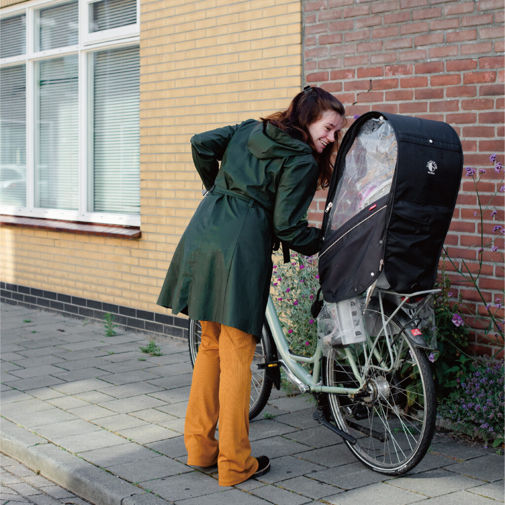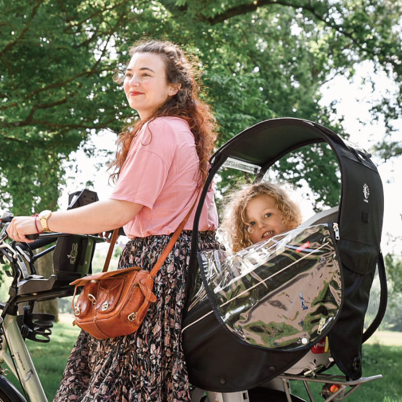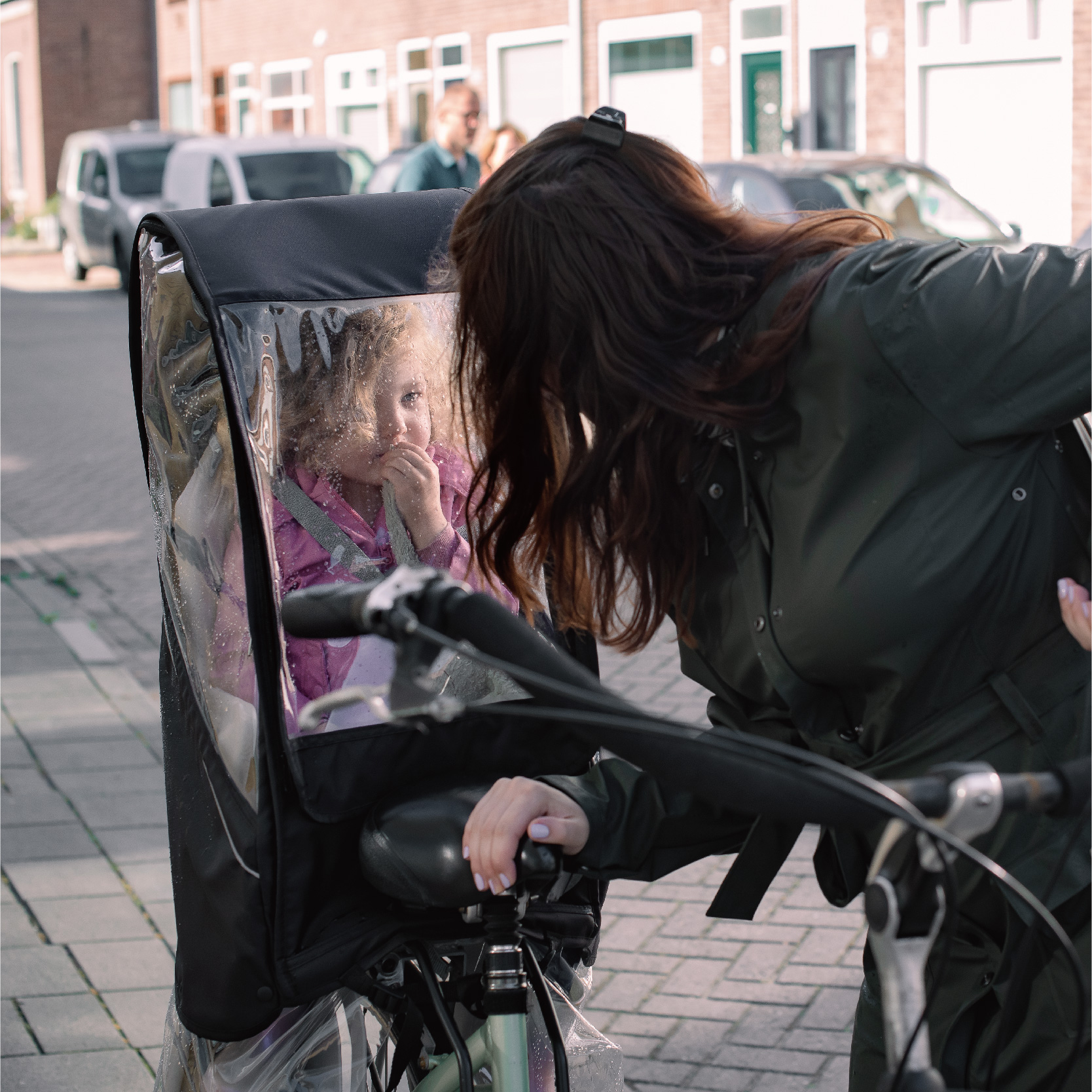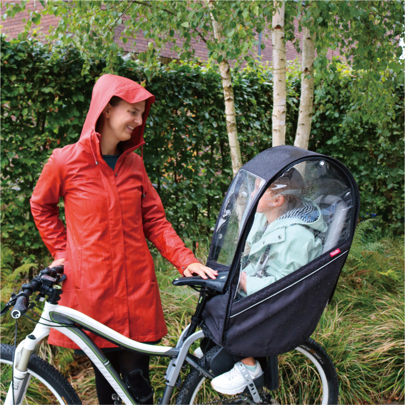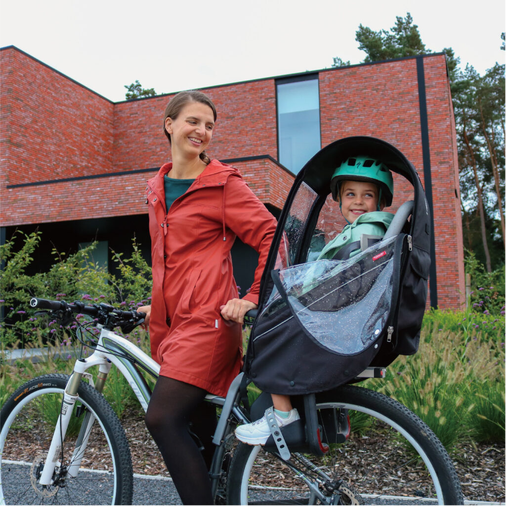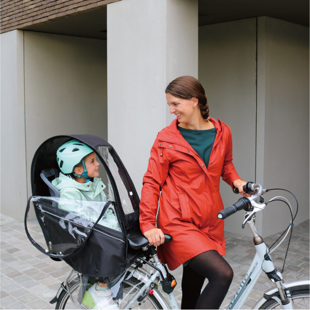 The weather protection cover protects the child sitting in the children’s bicycle seat from the rain and cold.