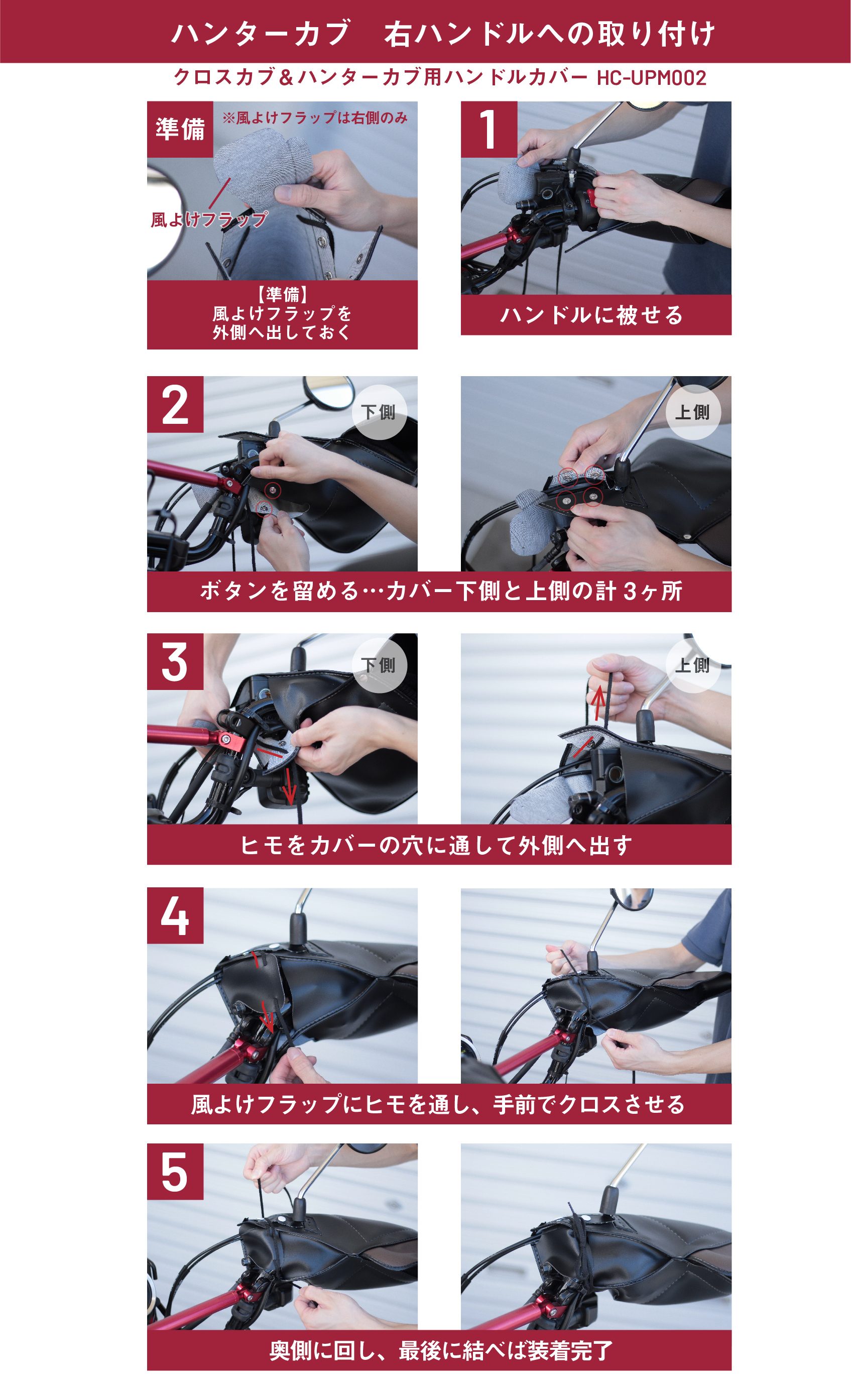 【注意】厚手のグローブを併用されますと、ハンドルカバーを装着していない時と比べ、スイッチの操作性が異なり、またハンドルカバーの破損の原因となります。素手もしくは薄手のグローブをご使用いただくことをお勧めします。