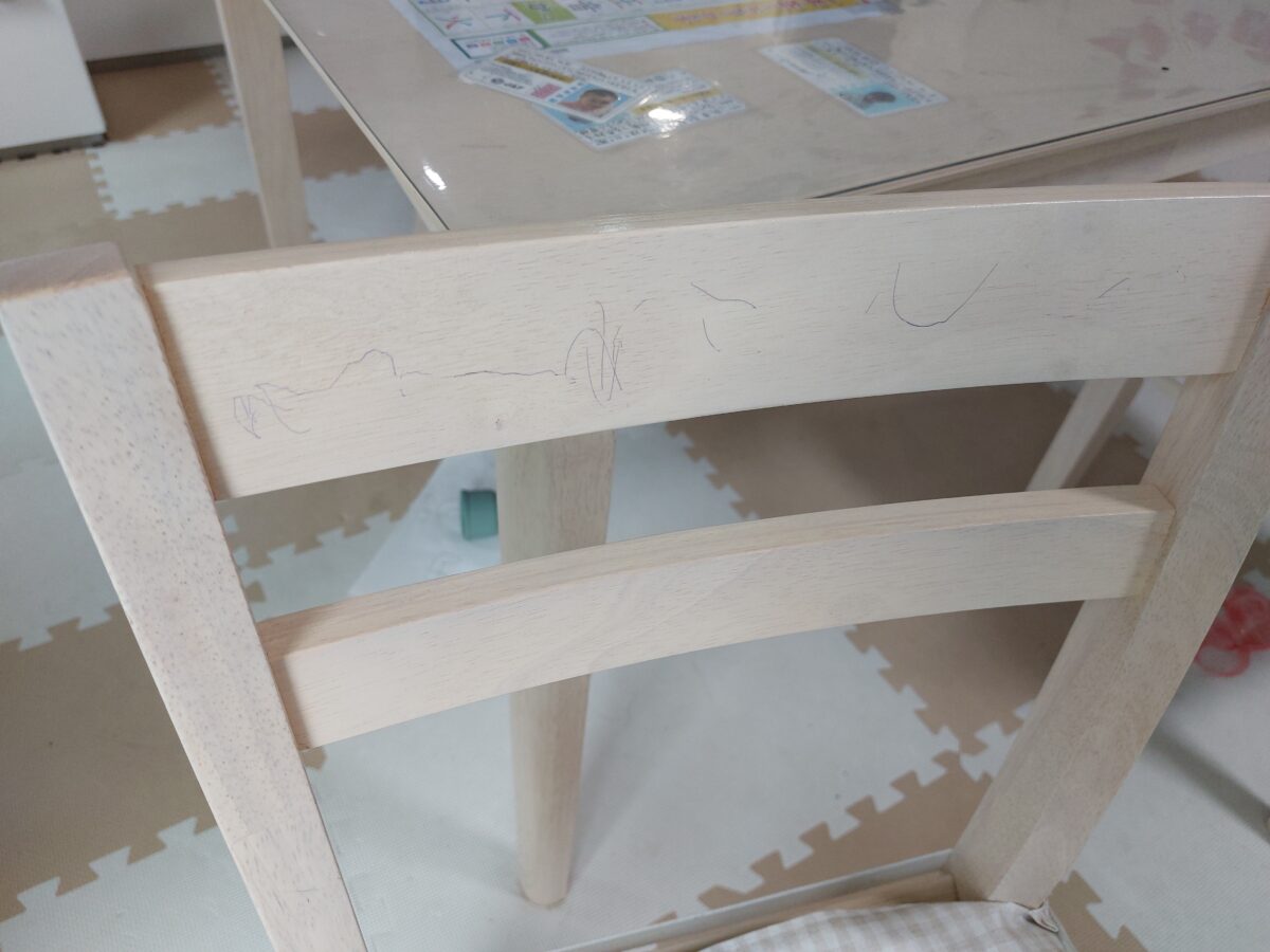 らくがきされていた事に気付いた! 大人しく描いてたではないか…( ・ω・) ボールペンで(@ ̄□ ̄@;)!! イス~!! 除光液が家に無かったので、何かボールペンのらくがきを落とせるものと、検索してクレンジングオイルで油 […]