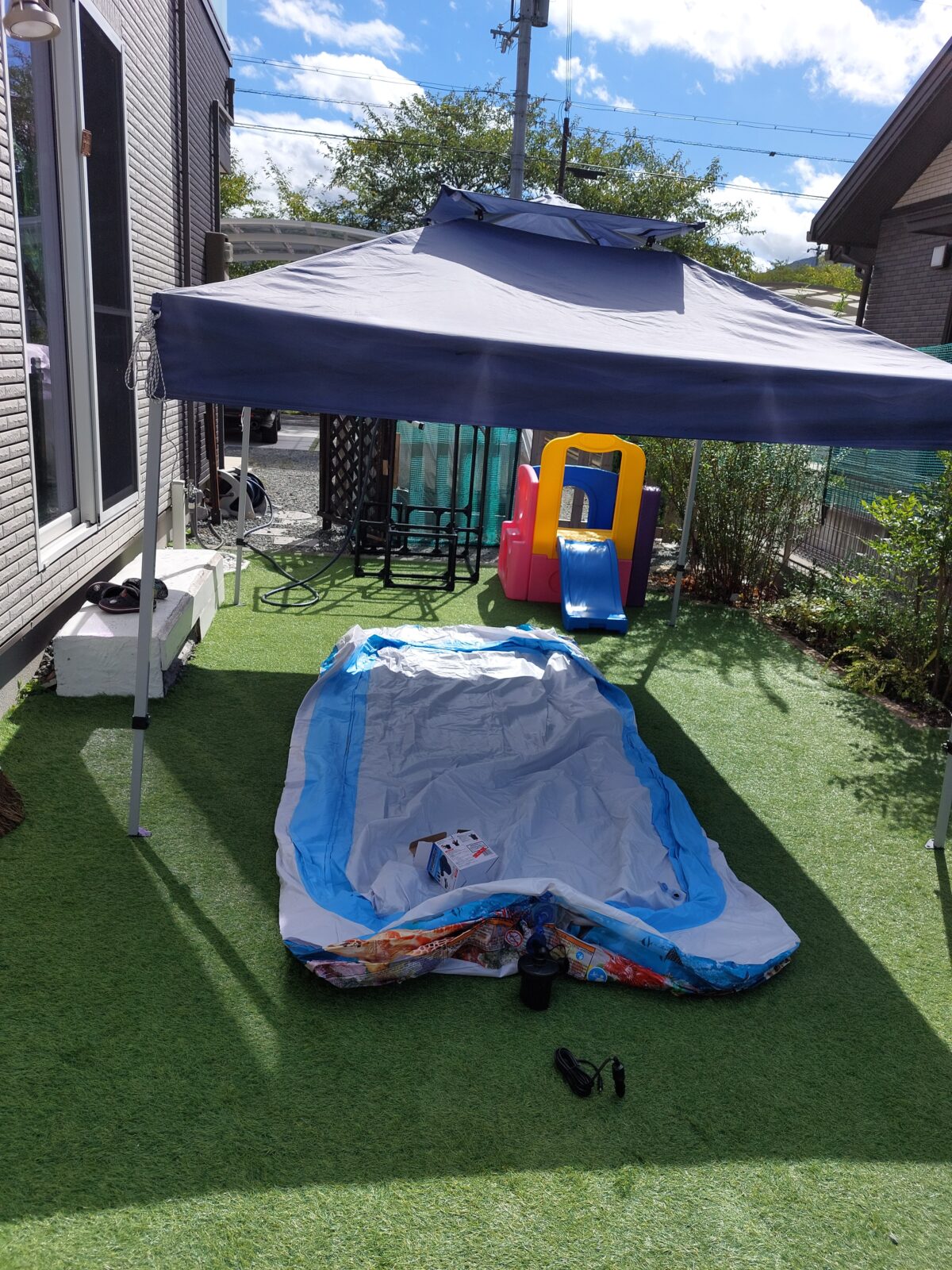 大人用のエプロンをリメイクしました! 祭日は超暑かったので、庭でテント張ってスーパーボールすくいをしました! からの~… 何回洗濯機を回したことか… いつだったかな…たつので夫とお食事!