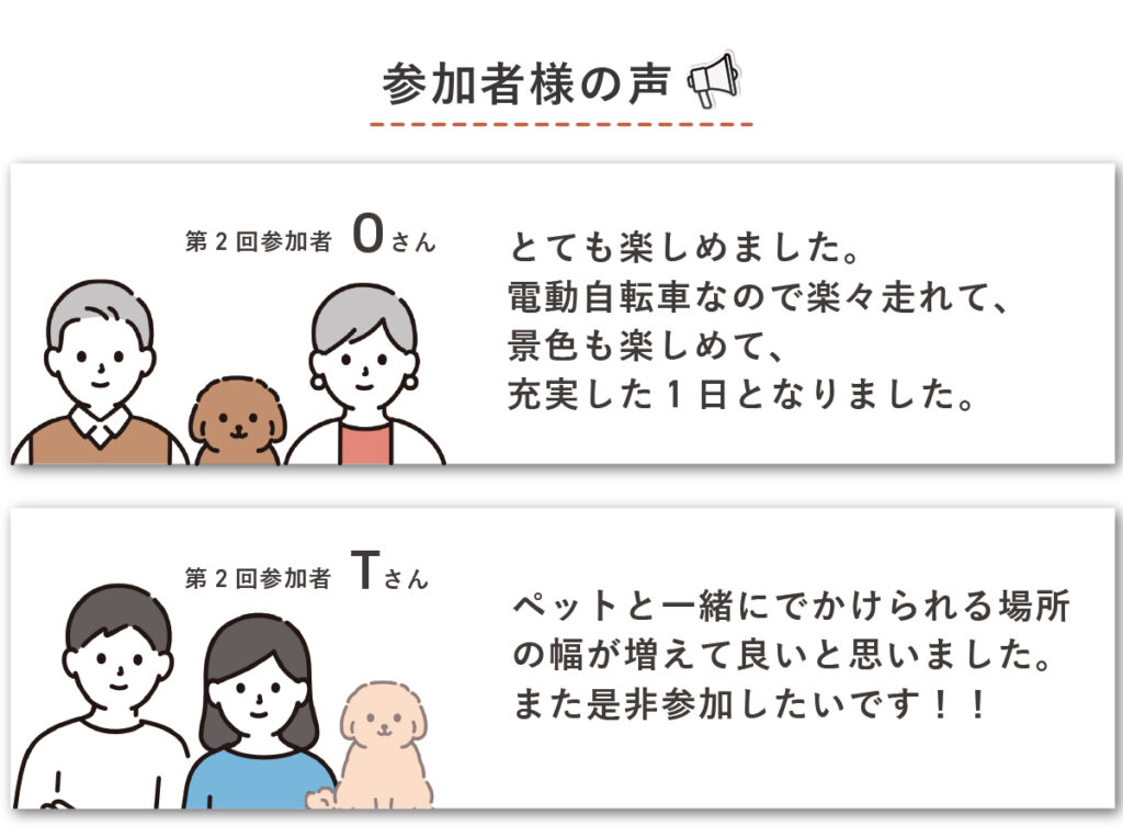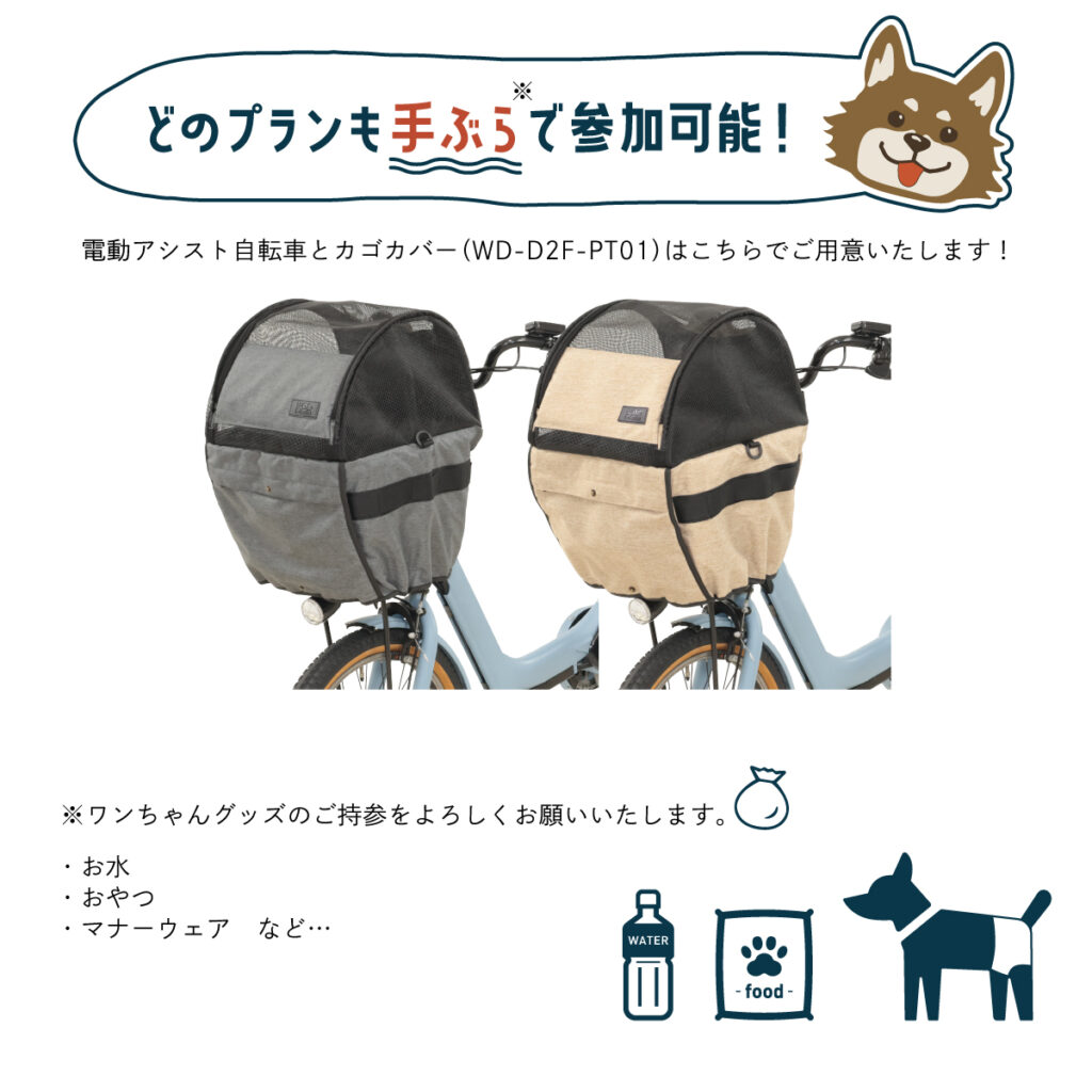 ※お申込み数の状況により犬と同乗されないお連れ様は電動アシスト自転車ではなく普通自転車をご利用いただく場合もございます。