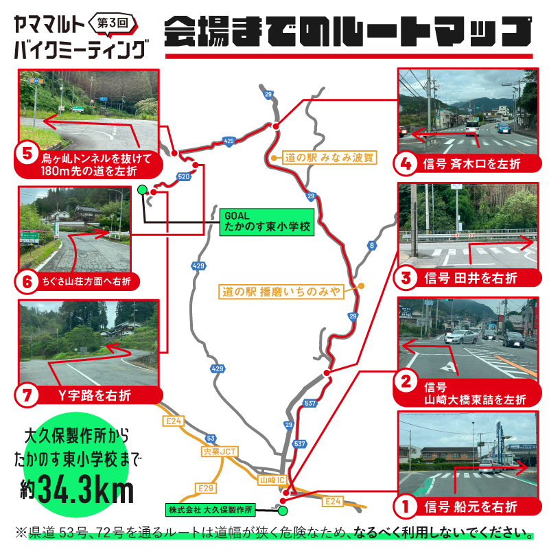 ・会場付近には、ガソリンスタンドが少ないため、あらかじめ十分に補給を行って参加をお願いします。