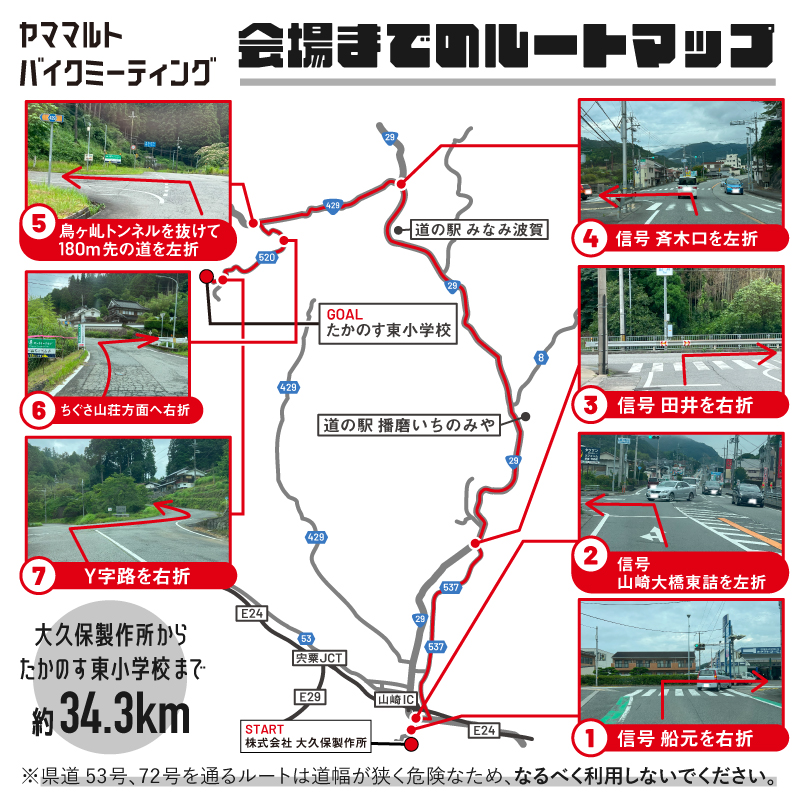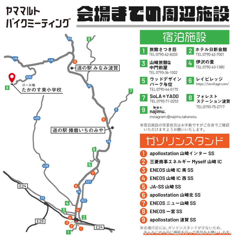 ・会場付近には、ガソリンスタンドが少ないため、あらかじめ十分に補給を行って参加をお願いします。