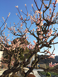 会社の裏庭に去年移植した大切な梅の木に淡い桃色の花が咲きました。