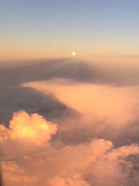 これ太陽では、ありません。夕焼けの中の満月です。上空では、空気が澄み切って暫し見惚れていました。