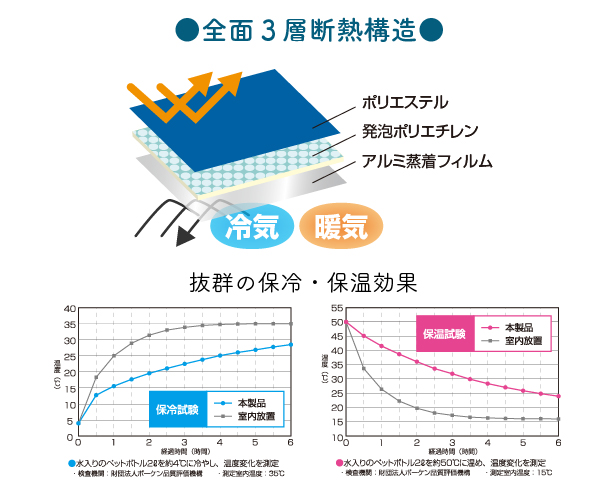 | 材質 | 表 : ポリエステル / PVC 内 : ポリエチレン 中 : アルミ蒸着フィルム |