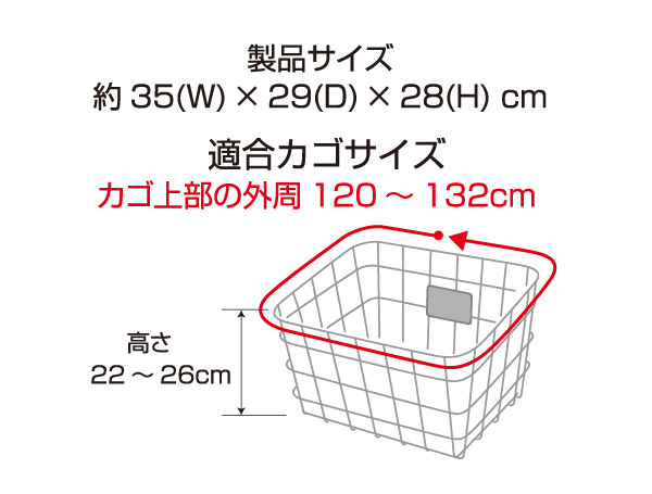| 適応カゴサイズ | 前用:周囲120~132cm程度 高さ22~26cm |