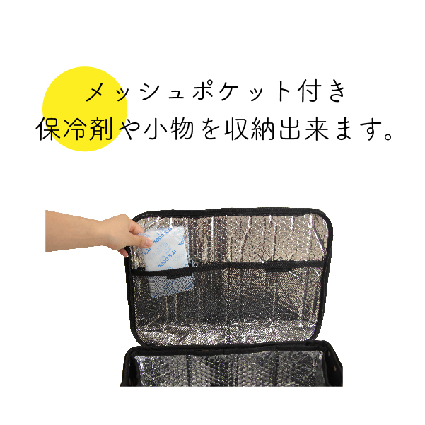 2リットルのペットボトルがスッポリおさまる大容量サイズ。(最大約31ℓ) 保冷剤や小物を収納できるメッシュポケット付き。
