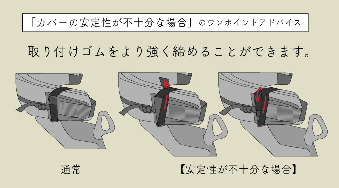 上カバーを装着する際はマジックテープを張り付けるだけの単純な作業となり、取り付けの際にマジックテープを少し下目に装着すれば、シートの穴をふさいで装着することができます。そのため、雨などは侵入しづらくなります。