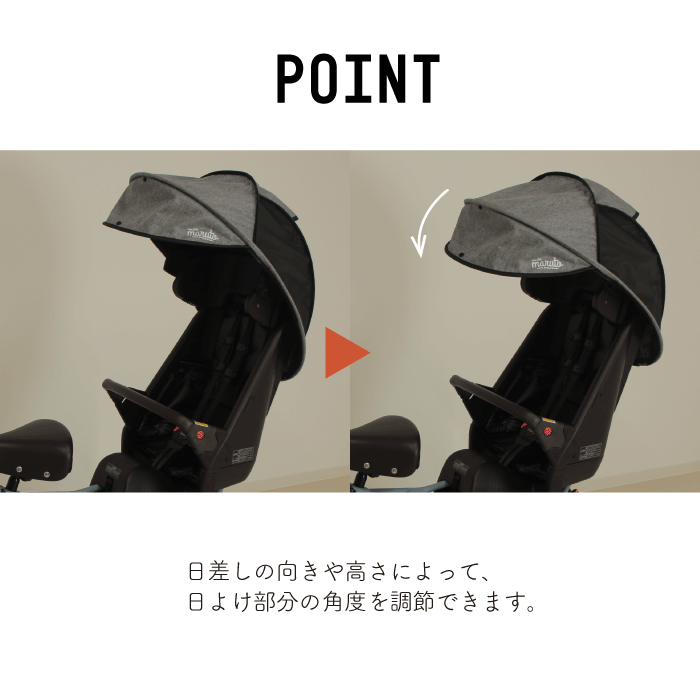 日よけ部分の調整は先端のツバ部分のみ調整(下す・上げる) ができます。 上げた時にボタンで固定できるようになっております。 ベビーカーの日よけ部分のように、大きく開閉できる構造ではありませんので、ご注 意ください。