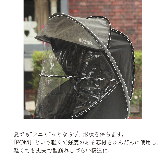 | 商品の特徴 | ・夏でも「日よけ」として使えるレインカバー ・オールシーズン使えるレインカバー ・型崩れしにくいー ・乗せ降ろしラクラク ・おしゃれな3カラー |