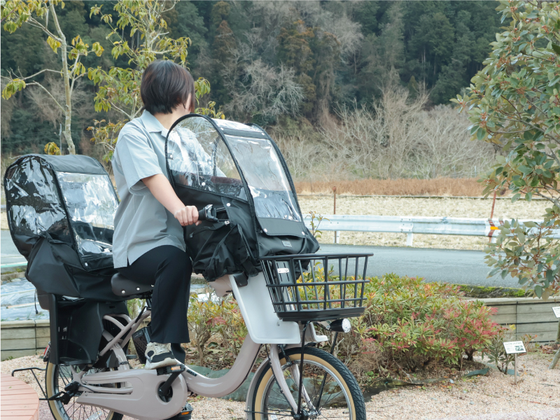 BikkeのチャイルドシートにD-5FA-BB01を装着する際に、ハンドル部分をカバーに通さず、ご使用されますと形が歪んでしまいます。左右のハンドルと背面フラップでカバーを支えることでカバーの崩れを予防します。
