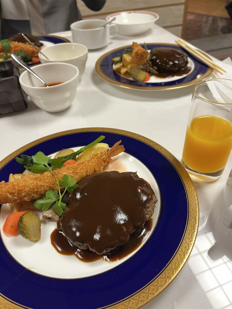 昼食は ハーフバイキング。ハーフってなんだ?と思いましたが、メインはこれ!ワンプレートで サイドメニューがバイキングでした。参加者の皆さんとご一緒させていただきました!