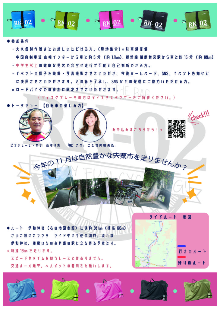 ゲストには『MCアケ』こと竹内明美さんと、自転車ショップ『ピアチェーレ』ヤマさんを迎え、楽しいトークショーなども盛りだくさんのイベントとなりました!